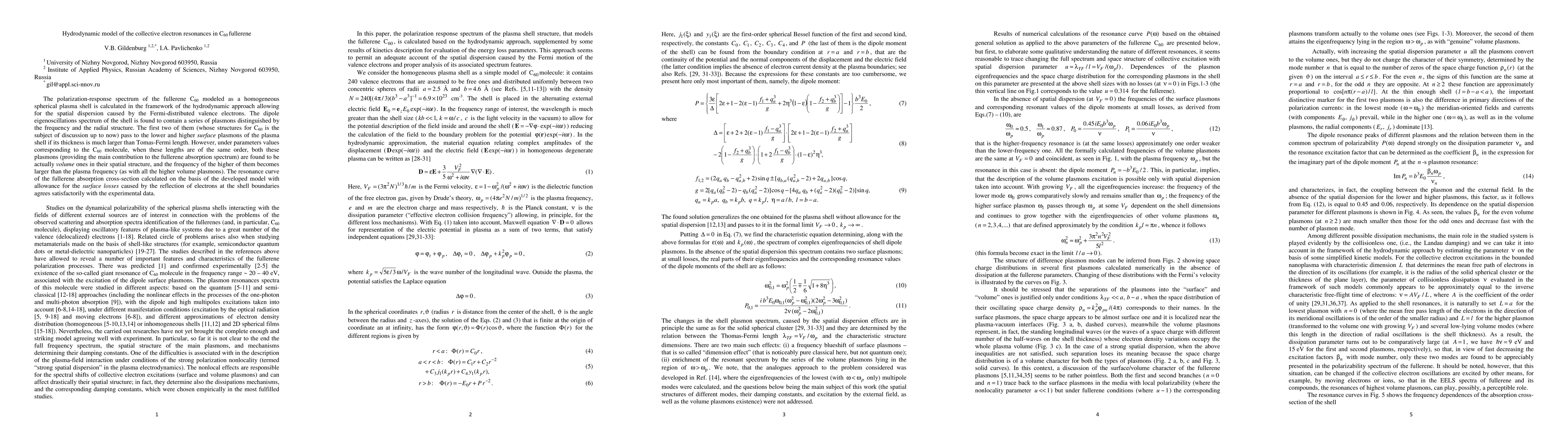 Researchers developed a hydrodynamic model to study collective electron resonances in C60 fullerene, finding that two low-frequency plasmons become volume plasmons under certain conditions, and their resonance curve agrees with experimental data.