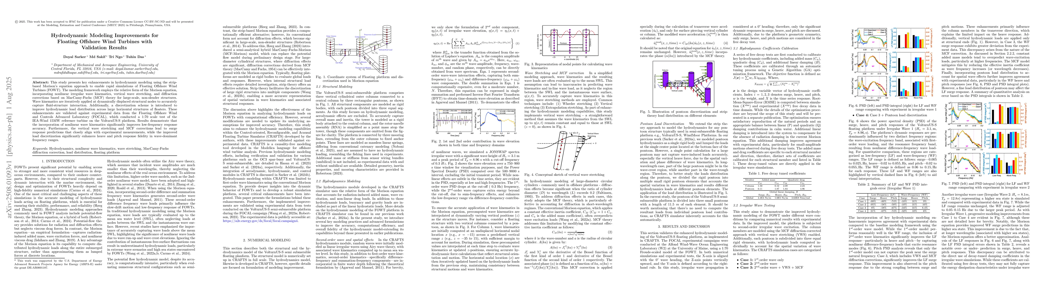 This study presents key enhancements in hydrodynamic modeling using the strip-based Morison's equation approach to enable rapid simulations of Floating Offshore Wind Turbines (FOWT). The modeling framework employs the relative form of the Morison equation, incorporating nonlinear irregular wave kinematics, vertical wave stretching, and diffraction corrections based on MacCamy-Fuchs (MCF) theory for large-scale, non-slender structures. Wave kinematics are iteratively applied at dynamically displaced structural nodes to accurately capture fluid-structure interaction. Additionally, a discretization scheme is introduced to improve hydrodynamic load distribution across large horizontal structures of floaters. These enhancements are validated against experimental data from the Floating Offshore Wind and Controls Advanced Laboratory (FOCAL), which conducted a 1:70 scale test of the IEA-Wind 15MW reference turbine on the VolturnUS-S platform. Results demonstrate that the incorporation of nonlinear wave kinematics significantly improves low-frequency response accuracy. Furthermore, the vertical wave stretching and MCF corrections lead to surge response predictions that closely align with experimental measurements, while the improved load discretization significantly enhances heave and pitch response fidelity in wave-dominant frequency ranges.