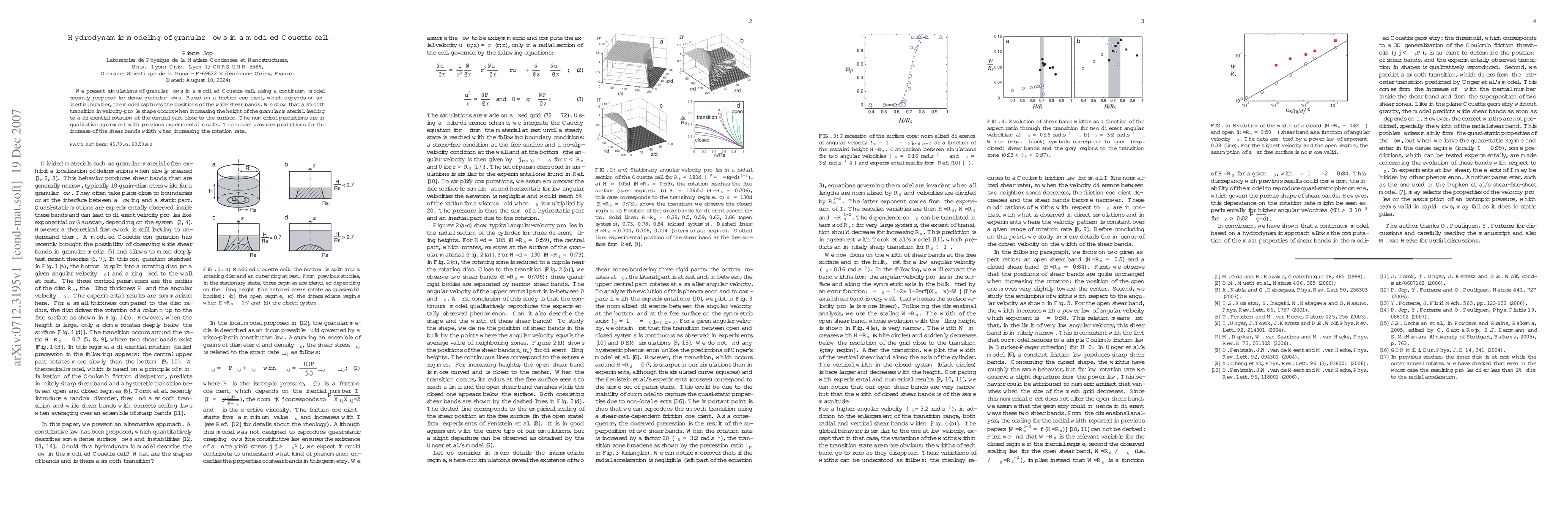 This study simulates granular flows in a modified Couette cell using a continuum model that correlates friction with an inertial number, accurately predicting the formation of shear bands. The model reveals a smooth transition in velocity profiles with increased material height and predicts the widening of shear bands with higher rotation rates, aligning with experimental observations.