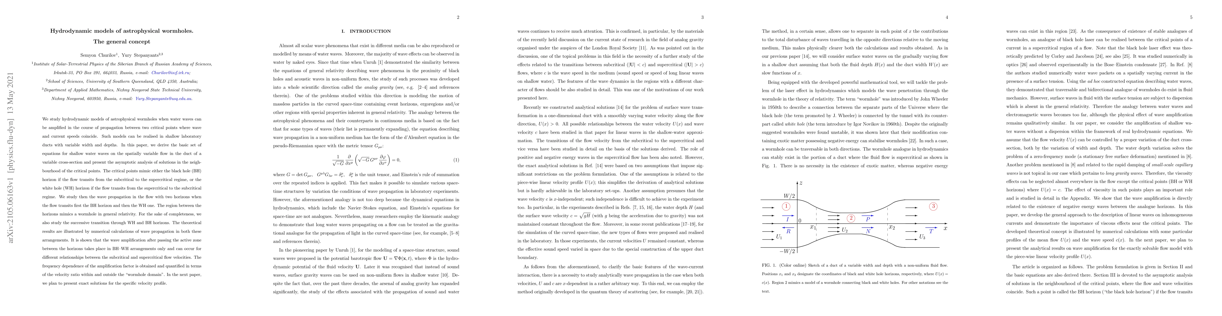 We study hydrodynamic models of astrophysical wormholes when water waves can be amplified in the course of propagation between two critical points where wave and current speeds coincide. Such models can be realised in shallow laboratory ducts with variable width and depths. In this paper, we derive the basic set of equations for shallow water waves on the spatially variable flow in the duct of a variable cross-section and present the asymptotic analysis of solutions in the neighbourhood of the critical points. The critical points mimic either the black hole (BH) horizon if the flow transits from the subcritical to the supercritical regime, or the white hole (WH) horizon if the flow transits from the supercritical to the subcritical regime. We study then, the wave propagation in the flow with two horizons when the flow transits first the BH horizon and then the WH one. The region between the horizons mimics a wormhole in general relativity. For the sake of completeness, we also study the successive transition through WH and BH horizons. The theoretical results are illustrated by numerical calculations of wave propagation in both these arrangements. It is shown that the wave amplification after passing the active zone between the horizons takes place in BH{WH arrangements only and can occur for different relationships between the subcritical and supercritical flow velocities. The frequency dependence of the amplification factor is obtained and quantified in terms of the velocity ratio within and outside the \wormhole domain". In the next paper, we plan to present exact solutions for the specific velocity profile.