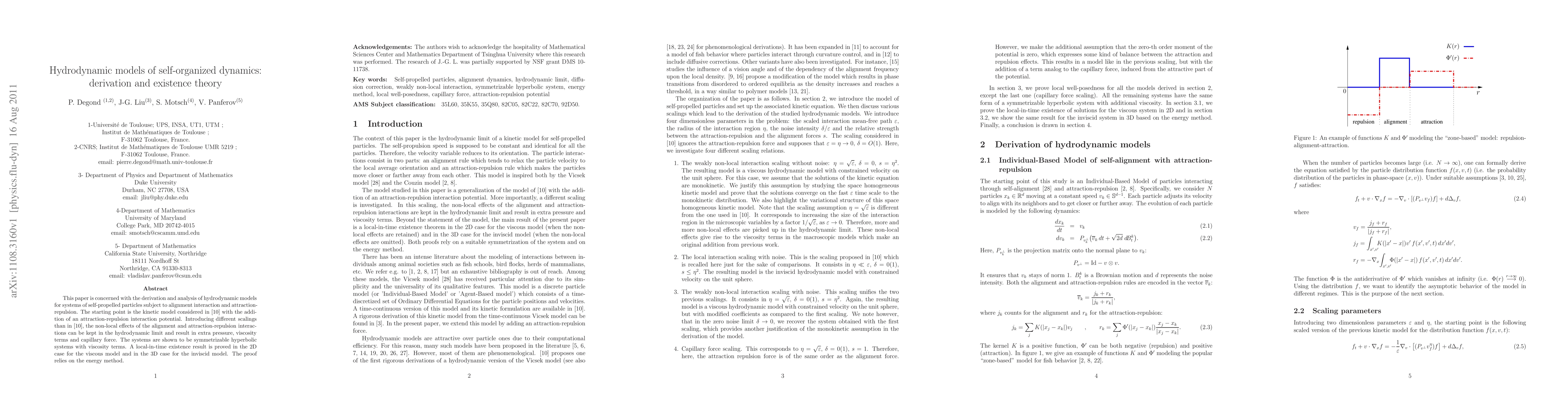 This paper derives hydrodynamic models for self-propelled particle systems with alignment and attraction-repulsion interactions, introducing new scalings that retain non-local effects. It proves local-in-time existence for these models using the energy method, establishing them as symmetrizable hyperbolic systems with viscosity terms.
