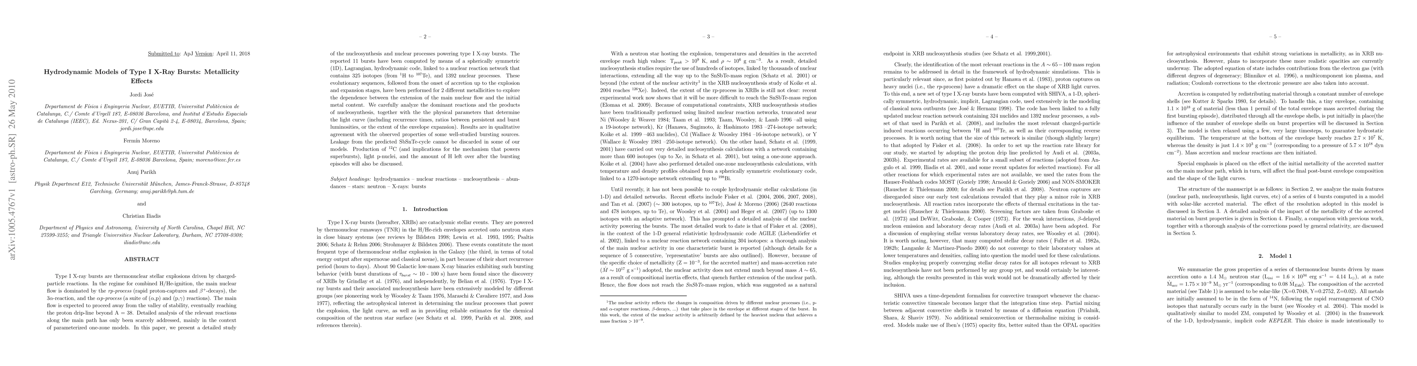 Researchers studied type I X-ray bursts using hydrodynamic models to understand how metallicity affects their behavior, finding that varying levels of metal content impact the burst's light curve and nucleosynthesis.