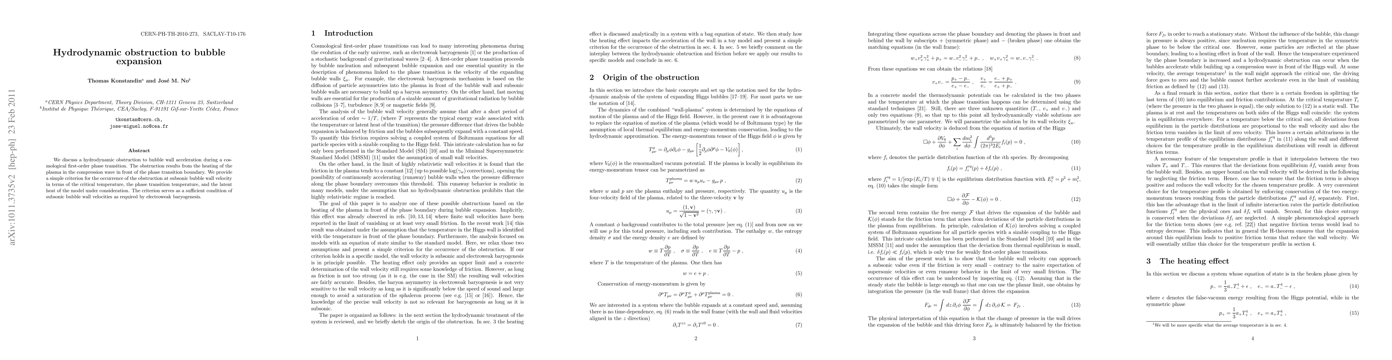 This paper explores hydrodynamic obstructions affecting bubble wall acceleration during cosmological first-order phase transitions, attributing the obstruction to plasma heating in front of the transition boundary. It establishes a criterion for the obstruction's occurrence based on critical temperature, phase transition temperature, and latent heat, crucial for subsonic bubble wall velocities in electroweak baryogenesis.