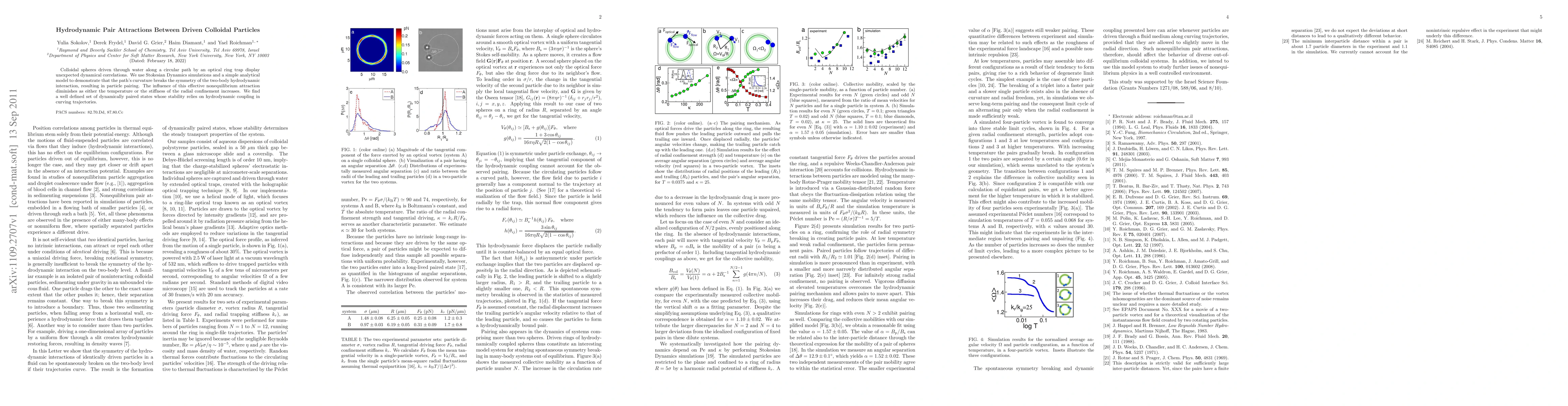This study reveals hydrodynamic pair attractions between colloidal particles driven in a circular path by an optical trap, showing that path curvature disrupts symmetry in two-body interactions, leading to particle pairing. The stability of these paired states depends on hydrodynamic coupling and diminishes with increased temperature or radial confinement stiffness.