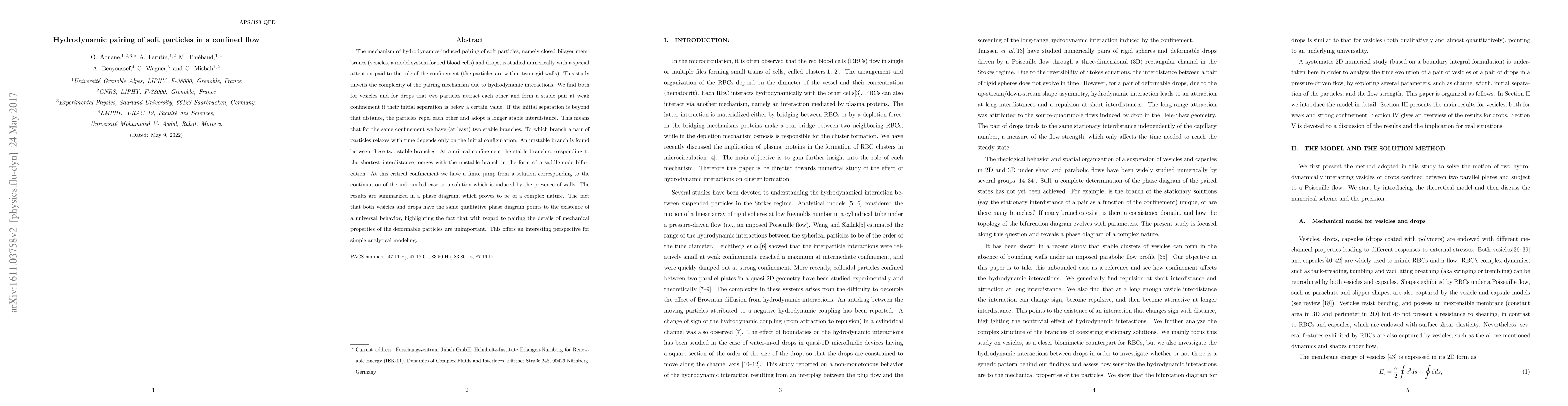 The mechanism of hydrodynamics-induced pairing of soft particles, namely closed bilayer membranes (vesicles, a model system for red blood cells) and drops, is studied numerically with a special attention paid to the role of the confinement (the particles are within two rigid walls). This study unveils the complexity of the pairing mechanism due to hydrodynamic interactions. We find both for vesicles and for drops that two particles attract each other and form a stable pair at weak confinement if their initial separation is below a certain value. If the initial separation is beyond that distance, the particles repel each other and adopt a longer stable interdistance. This means that for the same confinement we have (at least) two stable branches. To which branch a pair of particles relaxes with time depends only on the initial configuration. An unstable branch is found between these two stable branches. At a critical confinement the stable branch corresponding to the shortest interdistance merges with the unstable branch in the form of a saddle-node bifurcation. At this critical confinement we have a finite jump from a solution corresponding to the continuation of the unbounded case to a solution which is induced by the presence of walls. The results are summarized in a phase diagram, which proves to be of a complex nature. The fact that both vesicles and drops have the same qualitative phase diagram points to the existence of a universal behavior, highlighting the fact that with regard to pairing the details of mechanical properties of the deformable particles are unimportant. This offers an interesting perspective for simple analytical modeling.
