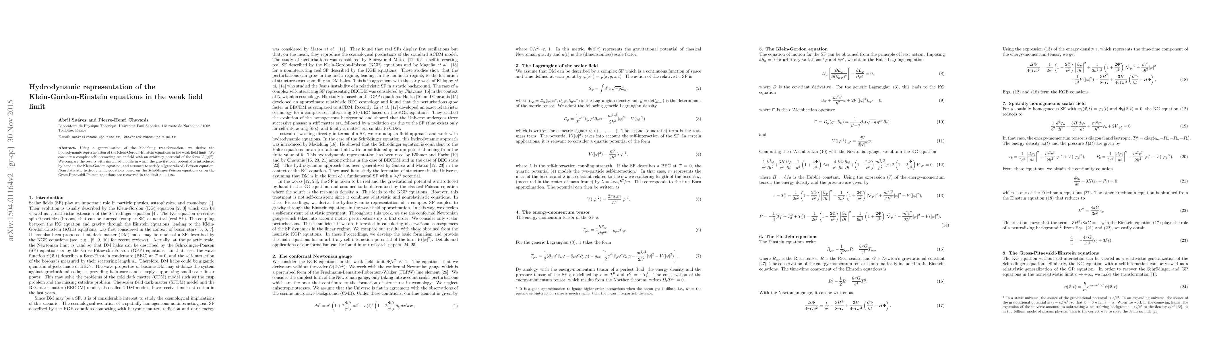 Using a generalization of the Madelung transformation, we derive the hydrodynamic representation of the Klein-Gordon-Einstein equations in the weak field limit. We consider a complex self-interacting scalar field with an arbitrary potential of the form $V(|\varphi|^2)$. We compare the results with simplified models in which the gravitational potential is introduced by hand in the Klein-Gordon equation, and assumed to satisfy a (generalized) Poisson equation. Nonrelativistic hydrodynamic equations based on the Schr\"odinger-Poisson equations or on the Gross-Pitaevskii-Poisson equations are recovered in the limit $c\rightarrow +\infty$.