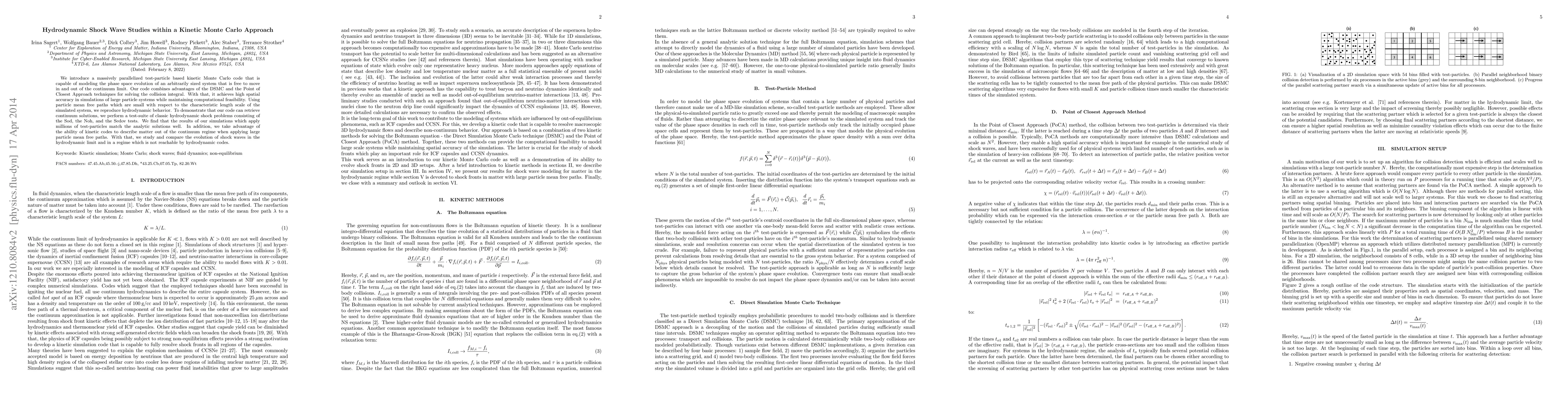 Kinetic approaches are routinely employed to simulate the dynamics of systems that are too rarified to be described by the Navier-Stokes equations. However, generally they are far too computationally expensive to be applied for systems that are governed by continuum hydrodynamics. In this paper, we introduce a massively parallelized test-particle based kinetic Monte Carlo code that is capable of modeling the phase space evolution of an arbitrarily sized system that is free to move in and out of the continuum limit. Using particle mean free paths which are small with respect to the characteristic length scale of the simulated system, we retrieve continuum behavior, while non-equilibrium effects are observed when the mean free path is increased. To demonstrate the ability of our code to reproduce hydrodynamic solutions, we apply a test-suite of classic hydrodynamic shock problems. Simulations using tens of millions of test-particles are found to reproduce the analytical solutions well.