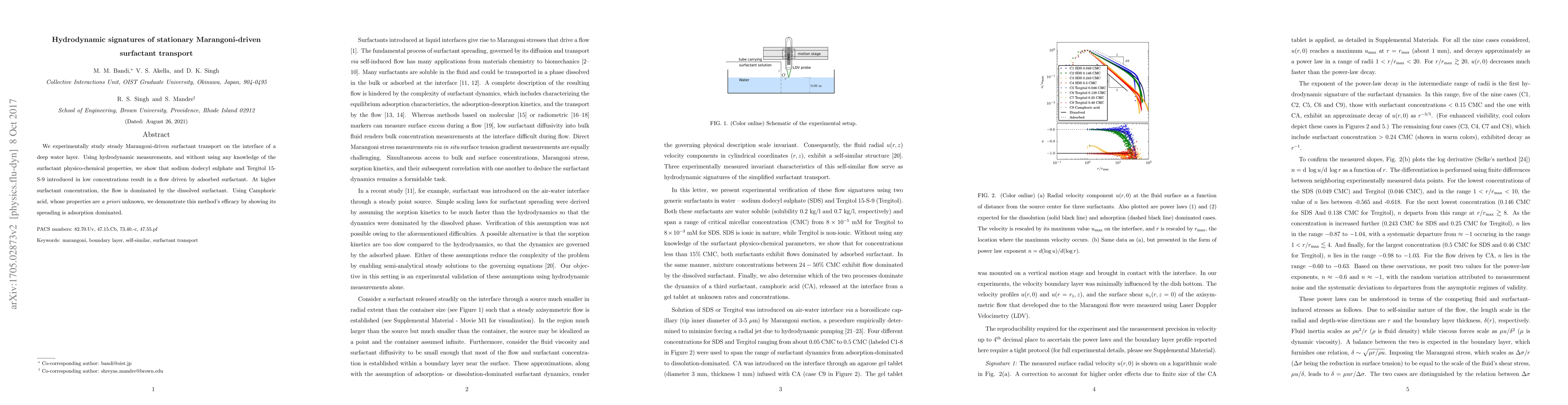 This study experimentally investigates steady Marangoni-driven surfactant transport on a deep water interface, revealing that low concentrations induce flow via adsorbed surfactant, while higher concentrations shift to dissolved surfactant dominance. The method's effectiveness is demonstrated with Camphoric acid, whose spreading behavior is adsorption-dominated despite unknown properties.