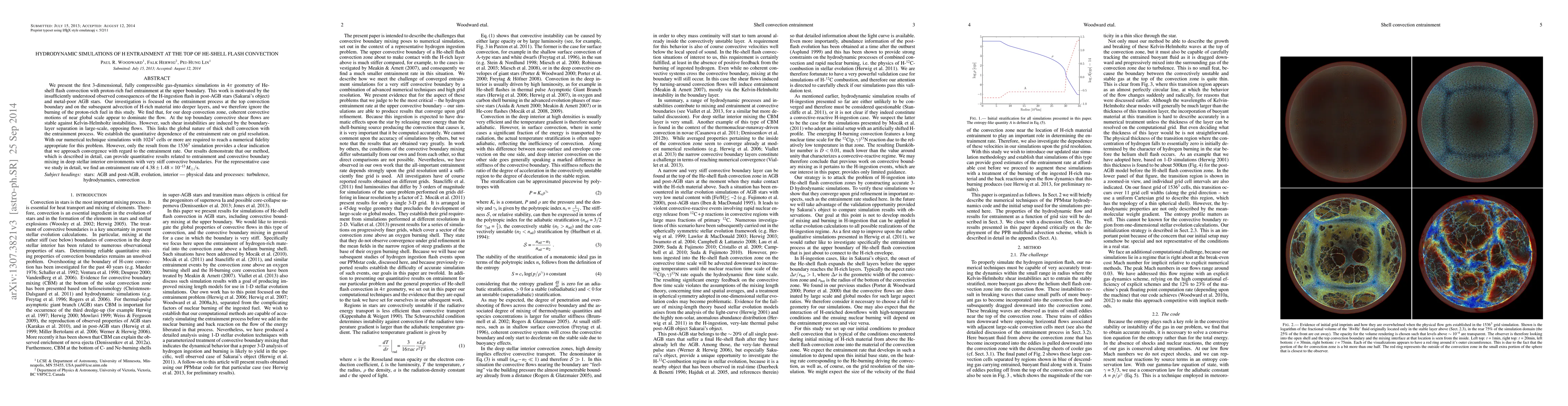 This paper presents the first 3D simulations of He-shell flash convection focusing on the entrainment of proton-rich material at the upper boundary, revealing stable convective shear flows but induced shear instabilities due to boundary-layer separation. The study finds an entrainment rate of $4.38 \pm 1.48 \times 10^{-13}M_\odot \mathrm{/s}$ and emphasizes the need for high-resolution simulations for accurate results.