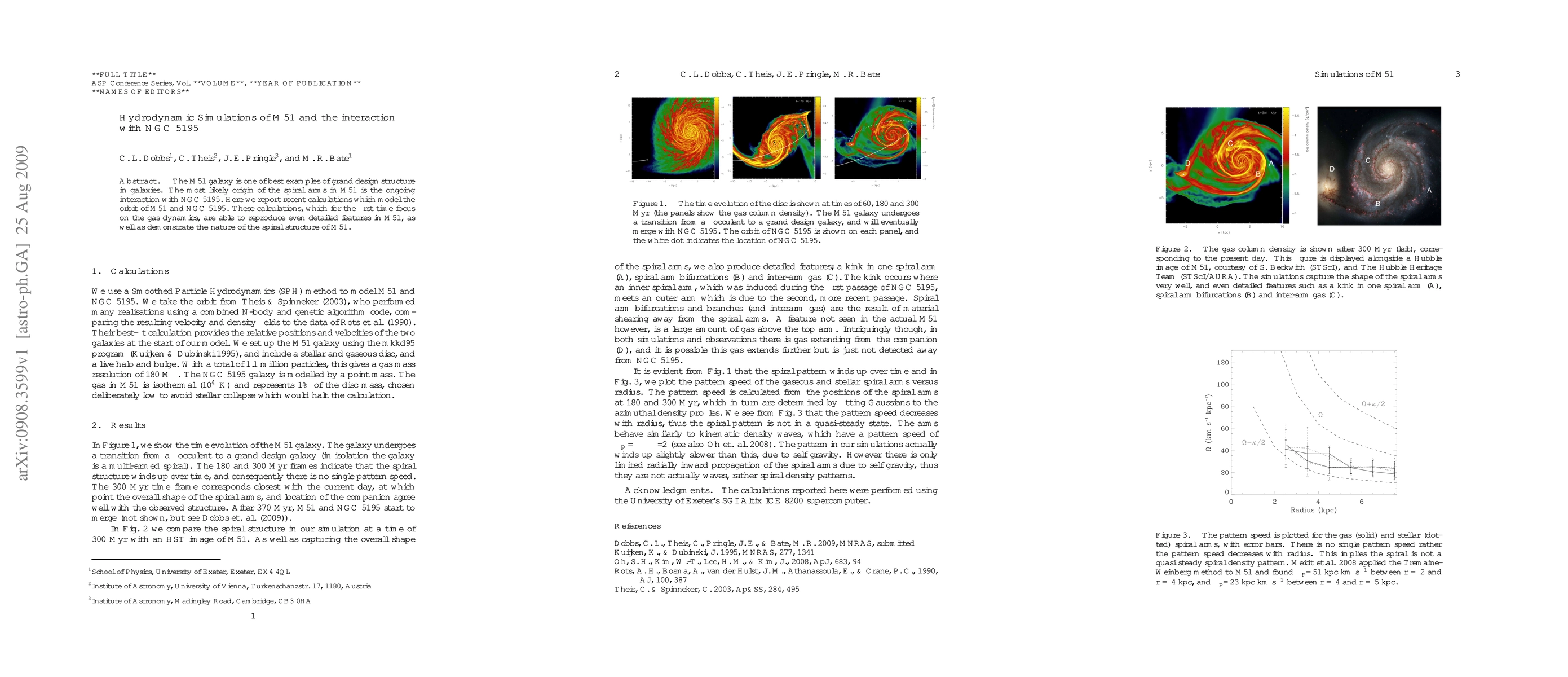 This paper presents hydrodynamic simulations modeling the interaction between M51 and NGC 5195, revealing the gas dynamics and detailed features of M51's grand design spiral structure likely caused by this interaction.
