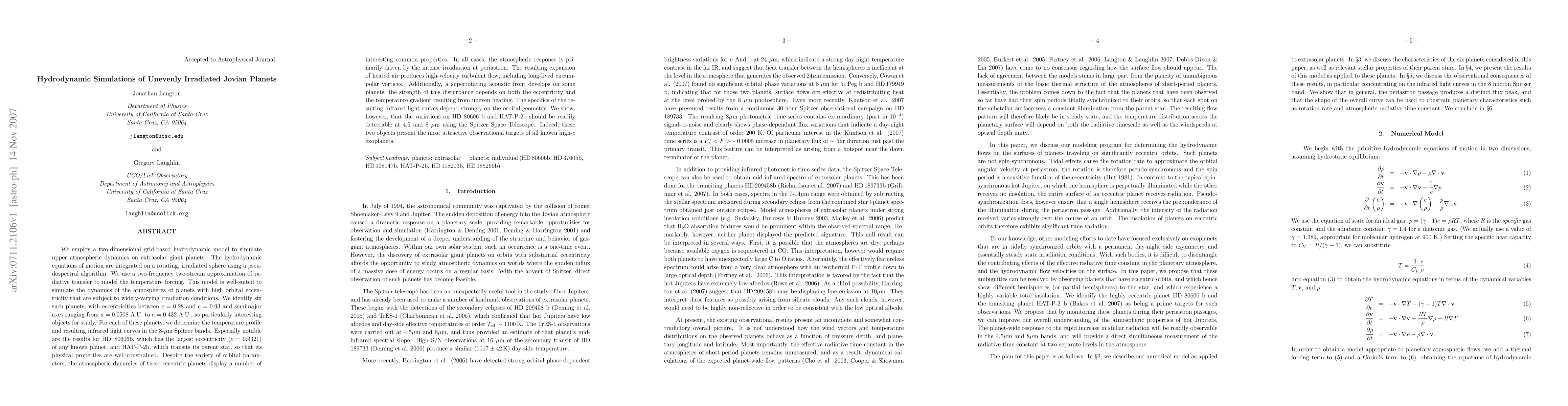 We employ a two-dimensional grid-based hydrodynamic model to simulate upper atmospheric dynamics on extrasolar giant planets. Our model is well-suited to simulate the dynamics of the atmospheres of planets with high orbital eccentricity that are subject to widely-varying irradiation conditions. We identify six such planets, with eccentricities between $e=0.28$ and $e=0.93$ and semimajor axes ranging from $a=0.0508$ A.U. to $a=0.432$ A.U., as particularly interesting objects for study. For each of these planets, we determine the temperature profile and resulting infrared light curves in the 8-$\mu$m Spitzer bands. Especially notable are the results for HD 80606b, which has the largest eccentricity ($e=0.9321$) of any known planet, and HAT-P-2b, which transits its parent star, so that its physical properties are well-constrained. Despite the variety of orbital parameters, the atmospheric dynamics of these eccentric planets display a number of interesting common properties. In all cases, the atmospheric response is primarily driven by the intense irradiation at periastron. The resulting expansion of heated air produces high-velocity turbulent flow, including long-lived circumpolar vortices. Additionally, a superrotating acoustic front develops on some planets; the strength of this disturbance depends on both the eccentricity and the temperature gradient resulting from uneven heating. The specifics of the resulting infrared light curves depend strongly on the orbital geometry. We show, however, that the variations on HD 80606 b and HAT-P-2b should be readily detectable at 4.5 and 8 $\mu$m using the Spitzer Space Telescope. Indeed, these two objects present the most attractive observational targets of all known high-$e$ exoplanets.