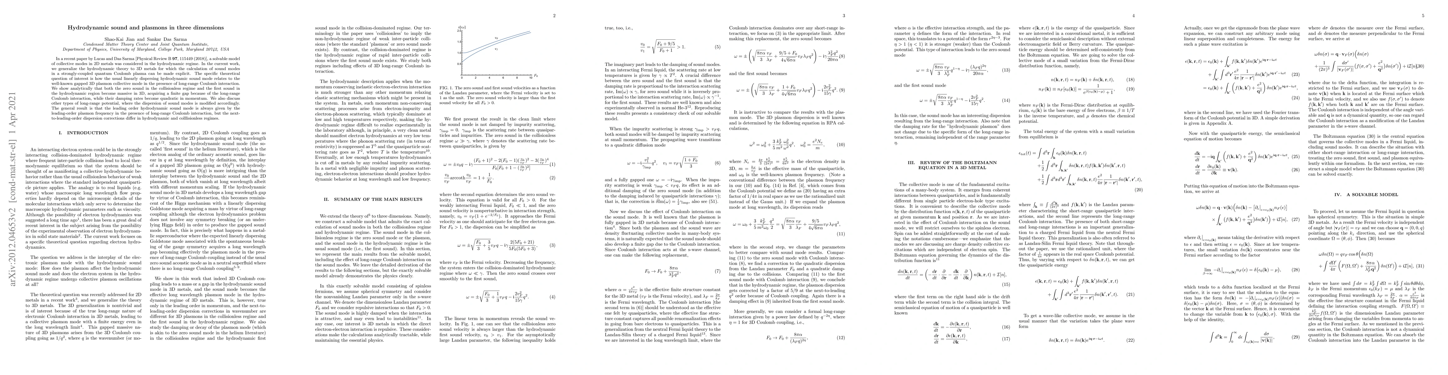 Researchers show that hydrodynamic sound modes in 3D metals acquire a finite gap due to long-range Coulomb interaction, while their damping rates become quadratic in momentum.
