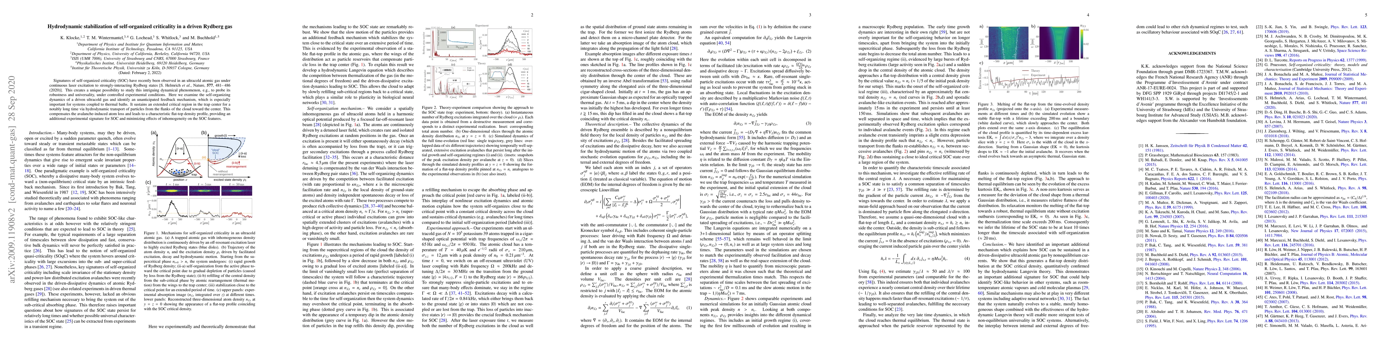 This paper investigates the hydrodynamic stabilization of self-organized criticality in a driven Rydberg gas, revealing a feedback mechanism that maintains a critical region via particle transport, resulting in a flat-top density profile and minimizing inhomogeneity effects.