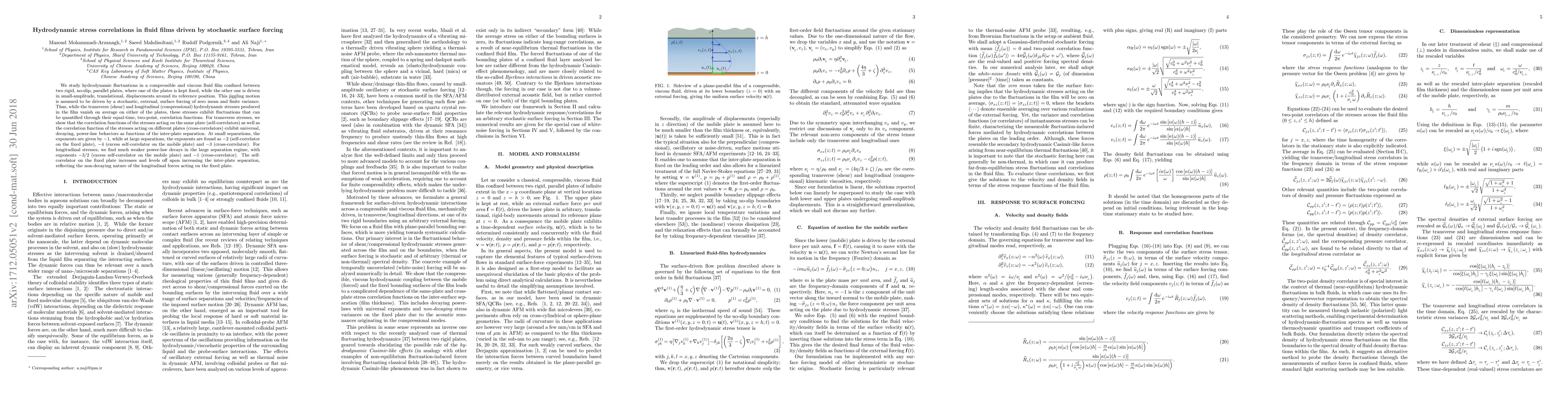 This study investigates hydrodynamic fluctuations in a fluid film between two parallel plates, with one plate driven by stochastic surface forcing. It reveals universal power-law decay behaviors for transverse stress correlation functions, while longitudinal stress correlations show weaker decay and non-decaying behavior on the fixed plate.