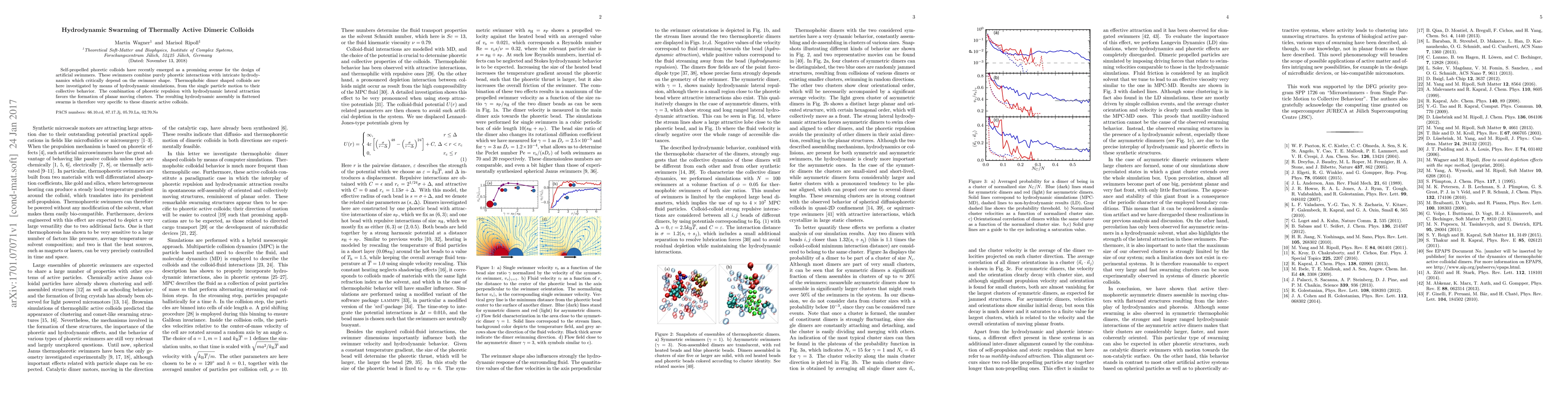 Self-propelled phoretic colloids have recently emerged as a promising avenue for the design of artificial swimmers. These swimmers combine purely phoretic interactions with intricate hydrodynamics which critically depend on the swimmer shape. Thermophobic dimer shaped colloids are here investigated by means of hydrodynamic simulations, from the single particle motion to their collective behavior. The combination of phoretic repulsion with hydrodynamic lateral attraction favors the formation of planar moving clusters. The resulting hydrodynamic assembly in flattened swarms is therefore very specific to these dimeric active colloids.