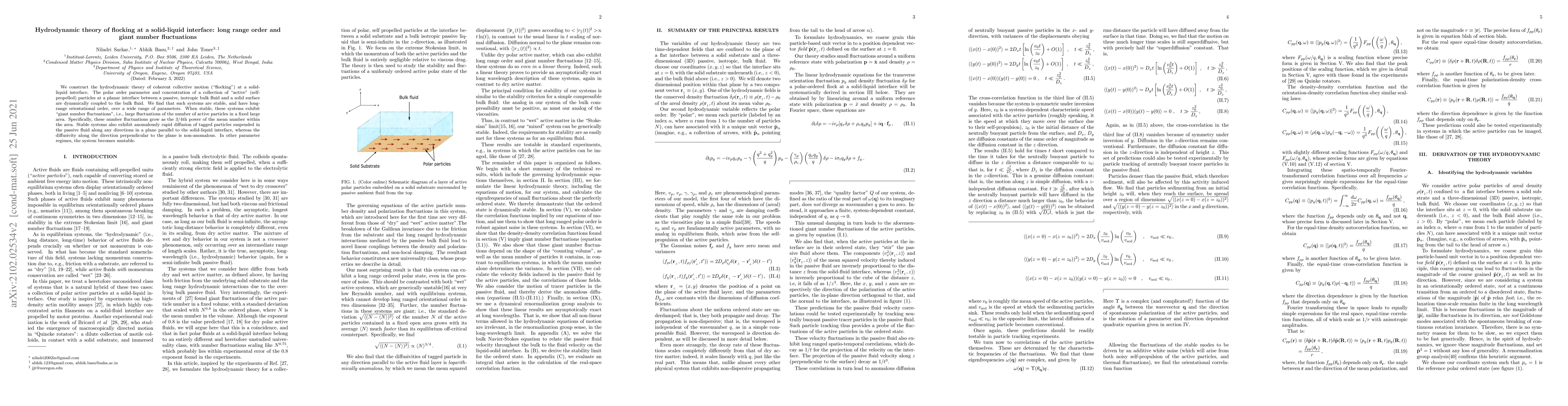 This paper develops a hydrodynamic theory of flocking at a solid-liquid interface, showing stable systems with long-range orientational order and giant number fluctuations that grow as the $3/4$th power of the mean number. It also reveals anomalously rapid diffusion parallel to the interface but normal diffusion perpendicular to it.