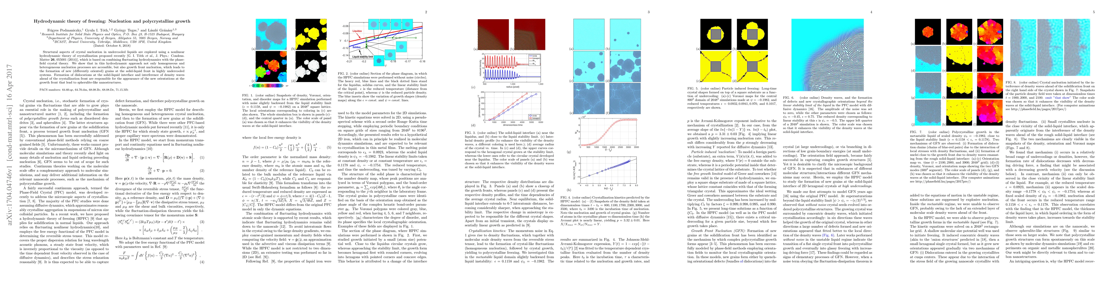 This paper employs a nonlinear hydrodynamic theory to explore the structural aspects of crystal nucleation in undercooled liquids, revealing the formation of new grains and spherulite-like nanostructures due to dislocations and density wave interference at the solid-liquid interface. The theory combines fluctuating hydrodynamics with phase-field crystal theory to model both nucleation and polycrystalline growth.