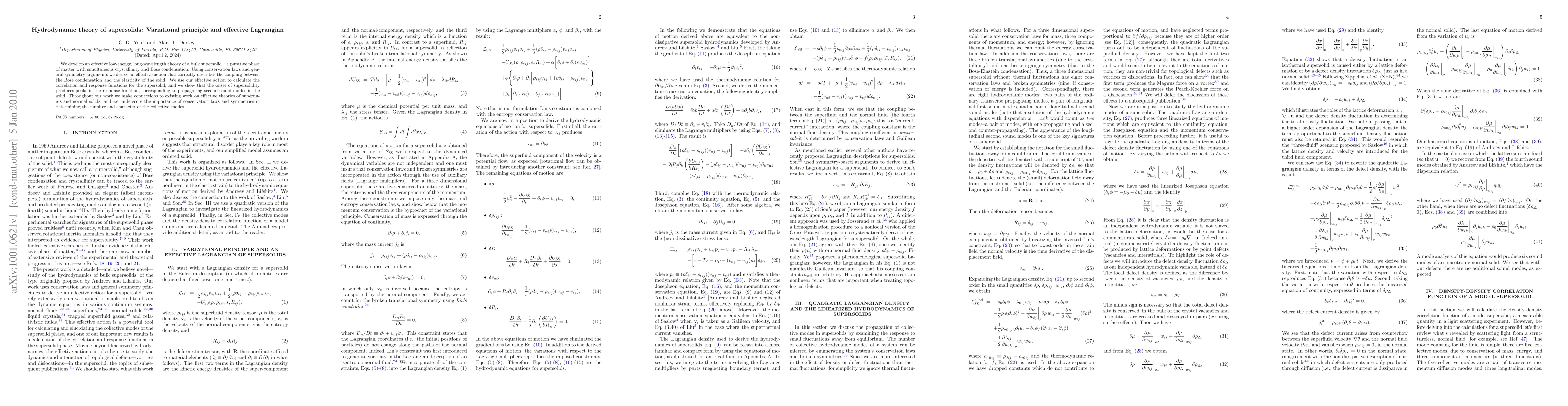 We develop an effective low-energy, long-wavelength theory of a bulk supersolid--a putative phase of matter with simultaneous crystallinity and Bose condensation. Using conservation laws and general symmetry arguments we derive an effective action that correctly describes the coupling between the Bose condensation and the elasticity of the solid. We use our effective action to calculate the correlation and response functions for the supersolid, and we show that the onset of supersolidity produces peaks in the response function, corresponding to propagating second sound modes in the solid. Throughout our work we make connections to existing work on effective theories of superfluids and normal solids, and we underscore the importance of conservation laws and symmetries in determining the number and character of the collective modes.
