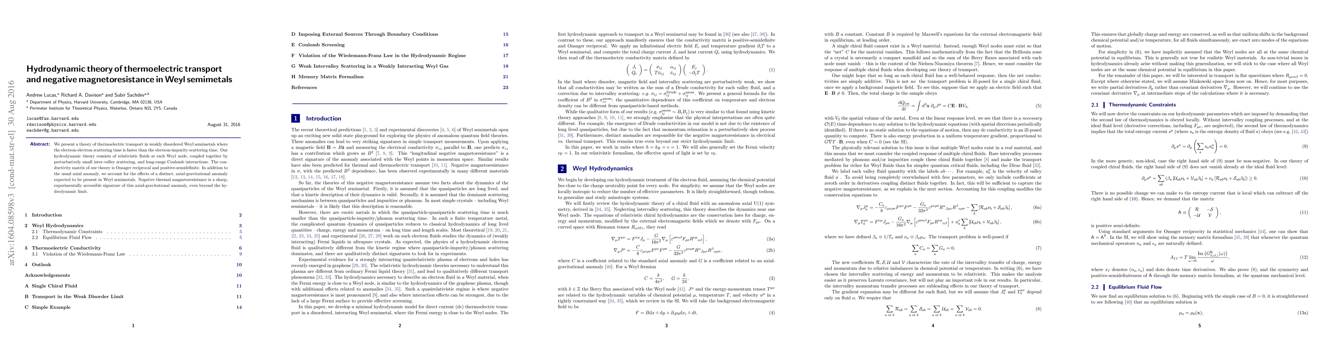 We present a theory of thermoelectric transport in weakly disordered Weyl semimetals where the electron-electron scattering time is faster than the electron-impurity scattering time. Our hydrodynamic theory consists of relativistic fluids at each Weyl node, coupled together by perturbatively small inter-valley scattering, and long-range Coulomb interactions. The conductivity matrix of our theory is Onsager reciprocal and positive-semidefinite. In addition to the usual axial anomaly, we account for the effects of a distinct, axial-gravitational anomaly expected to be present in Weyl semimetals. Negative thermal magnetoresistance is a sharp, experimentally accessible signature of this axial-gravitational anomaly, even beyond the hydrodynamic limit.