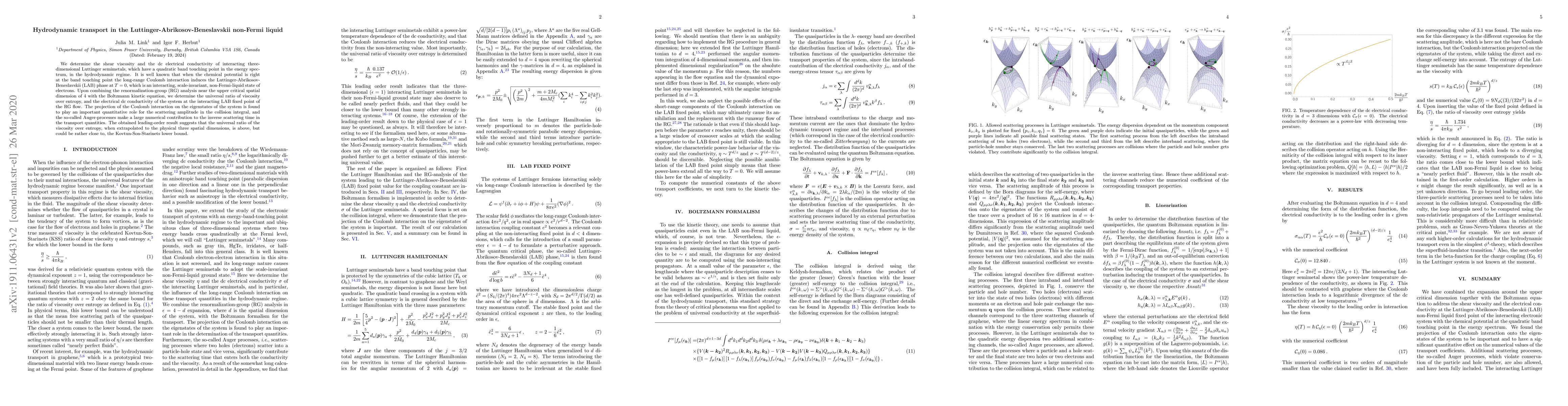 We determine the shear viscosity and the dc electrical conductivity of interacting three-dimensional Luttinger semimetals, which have a quadratic band touching point in the energy spectrum, in the hydrodynamic regime. It is well-known that when the chemical potential is right at the band touching point the long-range Coulomb interaction induces the Luttinger-Abrikosov-Beneslavskii (LAB) phase at T = 0, which is an interacting, scale-invariant, non-Fermi-liquid state of electrons. Upon combining the renormalization-group (RG) analysis near the upper critical spatial dimension of four with the Boltzmann kinetic equation, we determine the universal ratio of viscosity over entropy, and the electrical dc conductivity of the system at the interacting LAB fixed point of the RG flow. The projection of the Coulomb interaction on the eigenstates of the system is found to play an important quantitative role for the scattering amplitude in the collision integral, and the so-called Auger-processes make a large numerical contribution to the inverse scattering time in the transport quantities. The obtained leading order result suggests that the universal ratio of the viscosity over entropy, when extrapolated to the physical three spatial dimensions, is above, but could be rather close to, the Kovtun-Son-Starinets lower bound.