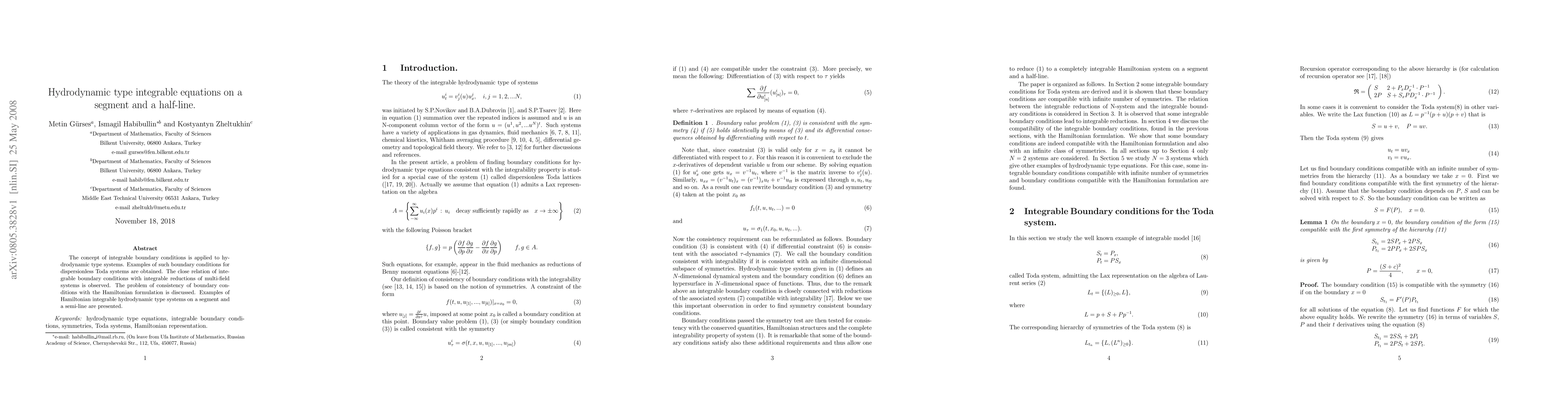 This paper explores integrable boundary conditions for hydrodynamic type systems, deriving examples for dispersionless Toda systems and discussing their consistency with Hamiltonian formulations. It also examines the relationship between these boundary conditions and integrable reductions of multi-field systems, providing examples on both segments and semi-lines.