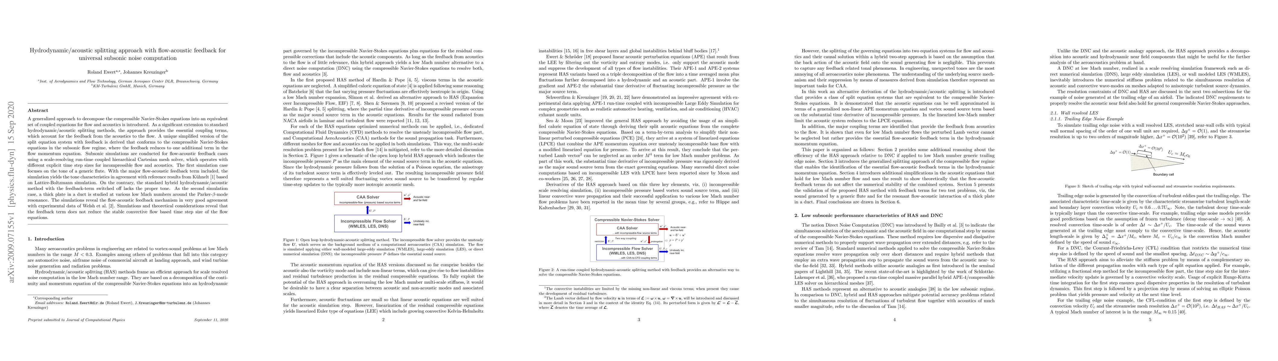 This research introduces a novel method to split compressible Navier-Stokes equations into flow and acoustic components, incorporating feedback from acoustics to flow. Simulations for flute tones and thick plate resonance show accurate results with this feedback term, unlike standard methods. The approach doesn't decrease the stable time step for flow equations.