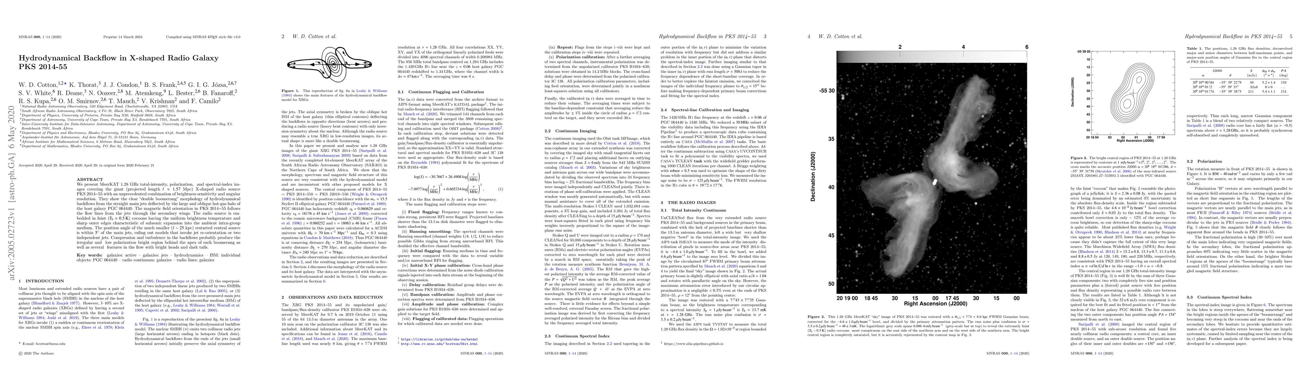We present MeerKAT 1.28 GHz total-intensity, polarization, and spectral-index images covering the giant (projected length $l \approx 1.57$~Mpc) X-shaped radio source PKS~2014$-$55 with an unprecedented combination of brightness sensitivity and angular resolution. They show the clear "double boomerang" morphology of hydrodynamical backflows from the straight main jets deflected by the large and oblique hot-gas halo of the host galaxy PGC~064440. The magnetic field orientation in PKS~2014$-$55 follows the flow lines from the jets through the secondary wings. The radio source is embedded in faint ($T_\mathrm{b} \approx 0.5 \mathrm{\,K}$) cocoons having the uniform brightness temperature and sharp outer edges characteristic of subsonic expansion into the ambient intra-group medium. The position angle of the much smaller ($l \sim 25$~kpc) restarted central source is within $5^\circ$ of the main jets, ruling out models that invoke jet re-orientation or two independent jets. Compression and turbulence in the backflows probably produce the irregular and low polarization bright region behind the apex of each boomerang as well as several features in the flow with bright heads and dark tails.