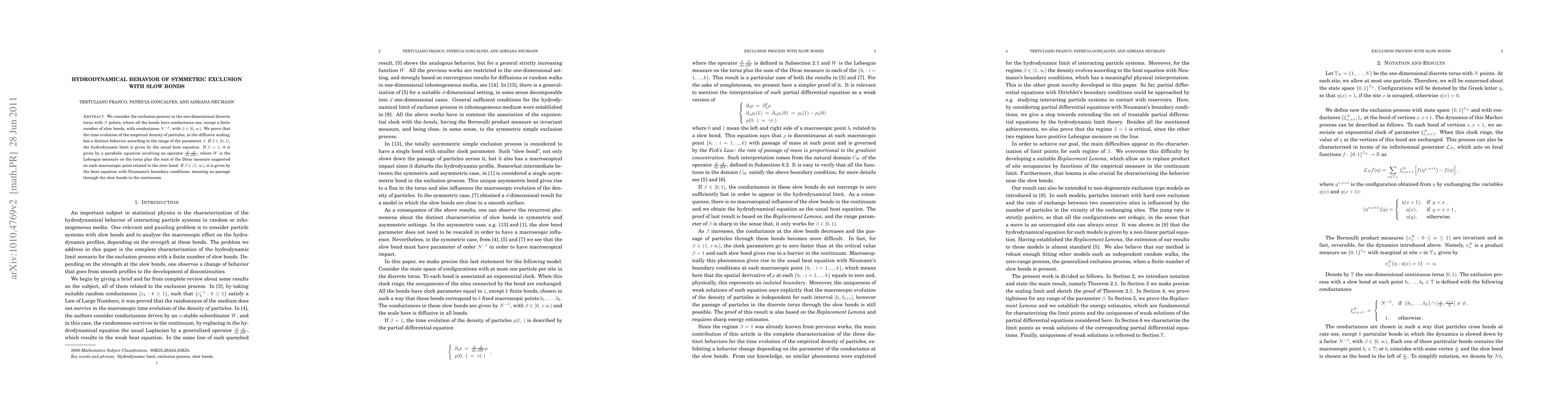 This paper studies the hydrodynamic behavior of a one-dimensional symmetric exclusion process with a few slow bonds, showing that the parameter $\beta$ determines the type of diffusion equation governing the empirical density. For $\beta\in[0,1)$, the usual heat equation applies, while for $\beta=1$, a modified parabolic equation emerges, and for $\beta\in(1,\infty)$, Neumann boundary conditions prevail.