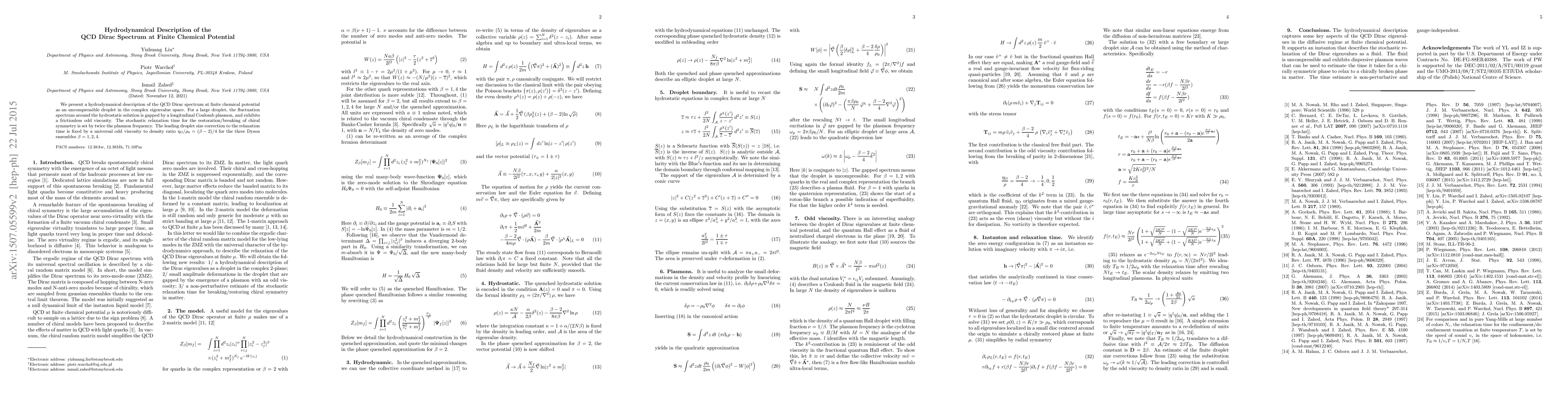 We present a hydrodynamical description of the QCD Dirac spectrum at finite chemical potential as an uncompressible droplet in the complex eigenvalue space. For a large droplet, the fluctuation spectrum around the hydrostatic solution is gapped by a longitudinal Coulomb plasmon, and exhibits a frictionless odd viscosity. The stochastic relaxation time for the restoration/breaking of chiral symmetry is set by twice the plasmon frequency. The leading droplet size correction to the relaxation time is fixed by a universal odd viscosity to density ratio $\eta_O/\rho_0=(\beta-2)/4$ for the three Dyson ensembles $\beta=1,2,4$.