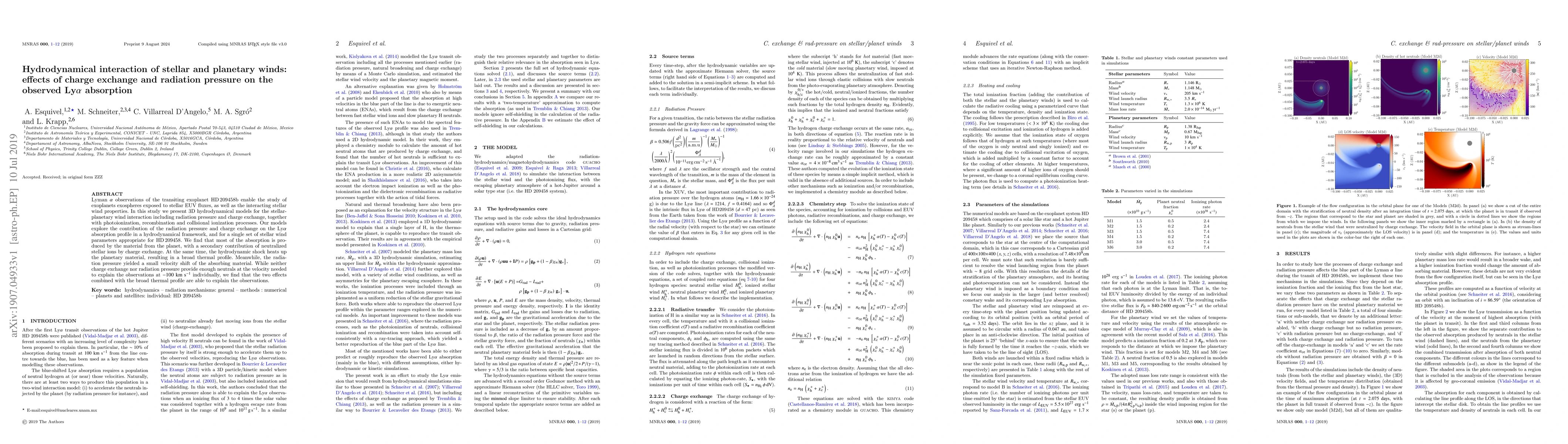 Lyman $\alpha$ observations of the transiting exoplanet HD 209458b enable the study of exoplanets exospheres exposed to stellar EUV fluxes, as well as the interacting stellar wind properties. In this study we present 3D hydrodynamical models for the stellar-planetary wind interaction including radiation pressure and charge exchange, together with photoionization, recombination and collisional ionization processes. Our models explore the contribution of the radiation pressure and charge exchange on the Ly$\alpha$ absorption profile in a hydrodynamical framework, and for a single set of stellar wind parameters appropriate for HD 209458. We find that most of the absorption is produced by the material from the planet, with a secondary contribution of neutralized stellar ions by charge exchange. At the same time, the hydrodynamic shock heats up the planetary material, resulting in a broad thermal profile. Meanwhile, the radiation pressure yielded a small velocity shift of the absorbing material. While neither charge exchange nor radiation pressure provide enough neutrals at the velocity needed to explain the observations at $-100~\mathrm{km~s^{-1}}$ individually, we find that the two effects combined with the broad thermal profile are able to explain the observations.