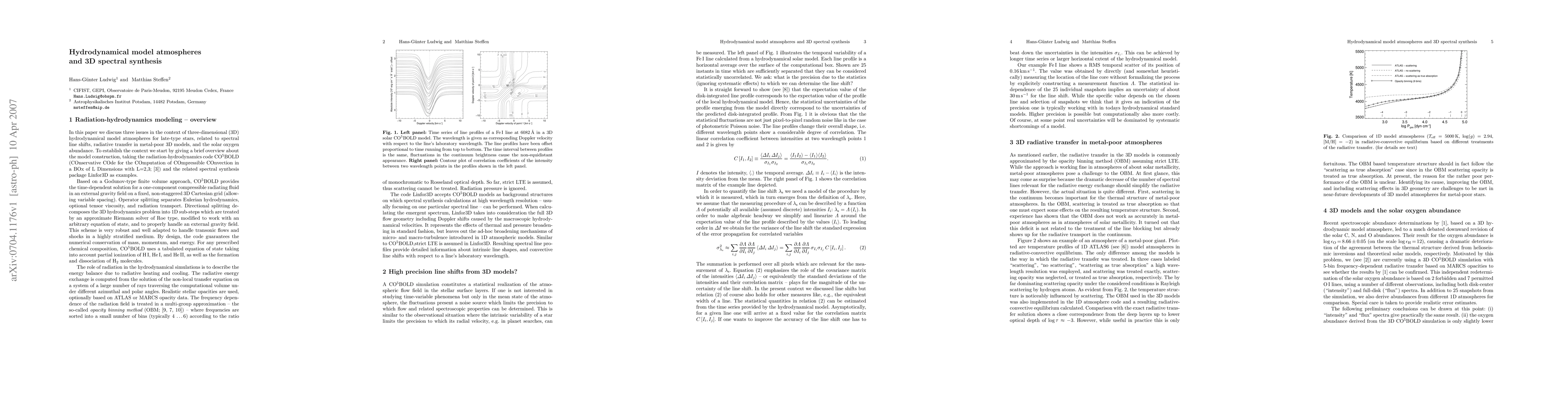 This paper explores three-dimensional hydrodynamical model atmospheres for late-type stars, focusing on spectral line shifts, radiative transfer in metal-poor models, and solar oxygen abundance. It employs the CO5BOLD code and Linfor3D package for model construction and spectral synthesis.
