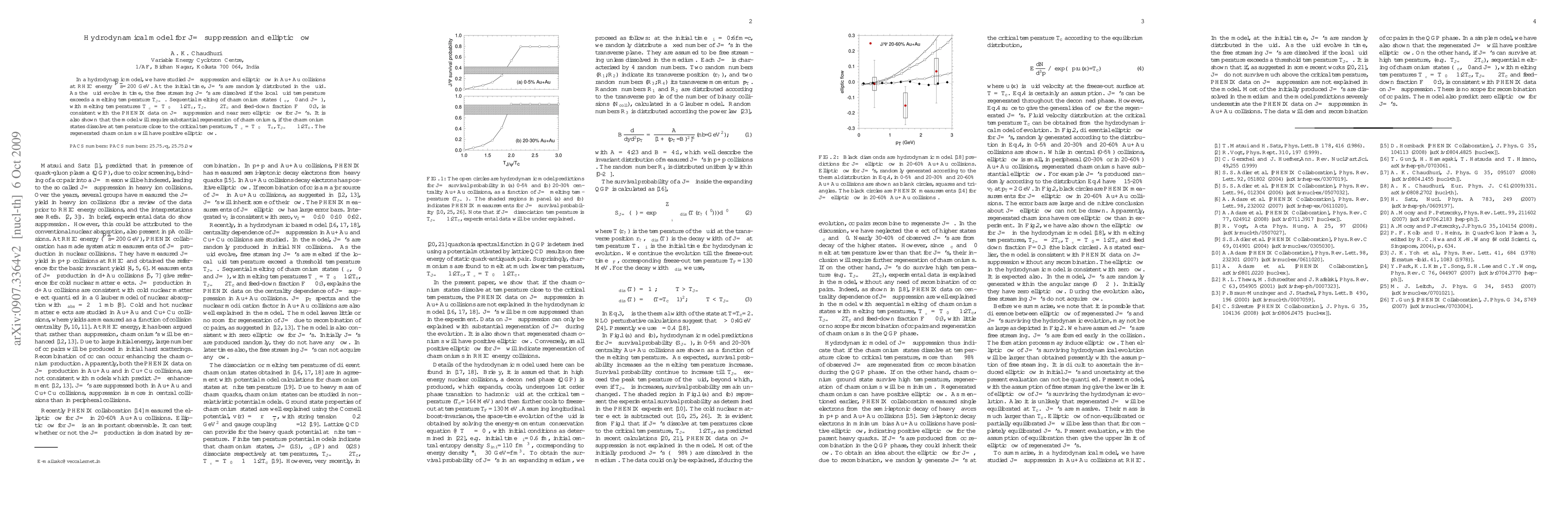 In a hydrodynamic model, we have studied $J/\psi$ suppression and elliptic flow in Au+Au collisions at RHIC energy $\sqrt{s}$=200 GeV. At the initial time, $J/\psi$'s are randomly distributed in the fluid. As the fluid evolve in time, the free streaming $J/\psi$'s are dissolved if the local fluid temperature exceeds a melting temperature $T_{J/\psi}$. Sequential melting of charmonium states ($\chi_c$, $\psi\prime$ and $J/\psi$), with melting temperatures $T_{\chi_c}=T_{\psi\prime} \approx 1.2T_c$, $T_{J/\psi} \approx2T_c$ and feed-down fraction $F\approx 0.3$, is consistent with the PHENIX data on $J/\psi$ suppression and near zero elliptic flow for $J/\psi$'s. It is also shown that the model will require substantial regeneration of charmoniums, if the charmonium states dissolve at temperature close to the critical temperature, $T_{\chi_c}=T_{\psi\prime} \leq T_c$, $T_{J/\psi}\approx1.2T_c$. The regenerated charmoniums will have positive elliptic flow.