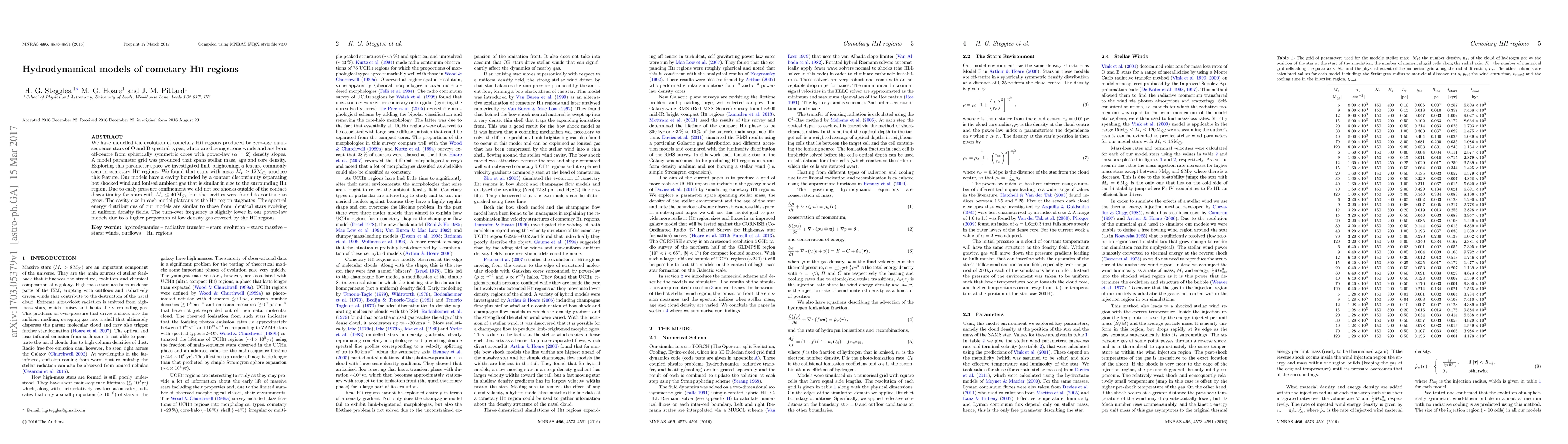 This research models cometary HII regions created by massive O and B type stars off-center from spherical cores with power-law density. Findings indicate that stars with at least 12 solar masses exhibit limb-brightening, a common feature in these regions. Cavities formed are comparable in size to the HII regions, growing but not showing shocks outside a contact discontinuity for less massive stars. The models' SEDs resemble those of stars in uniform fields, with a slightly lower turn-over frequency due to lower-density gas coverage.