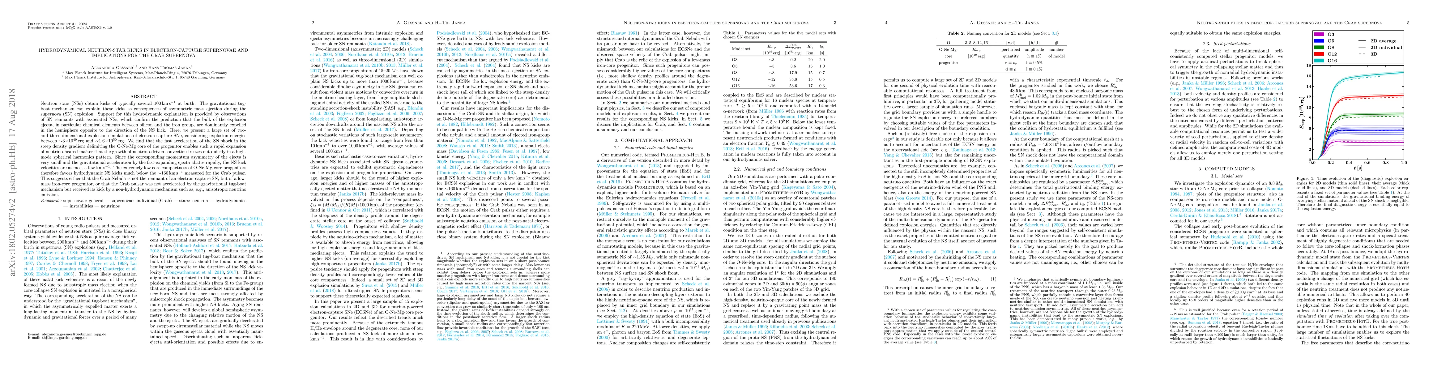 This research presents simulations of electron-capture supernovae, finding that neutron star kicks are typically below a few km/s due to the rapid expansion of neutrino-heated matter. The study suggests the Crab pulsar's high kick velocity implies it may not result from an electron-capture supernova, hinting at non-hydrodynamic acceleration mechanisms.