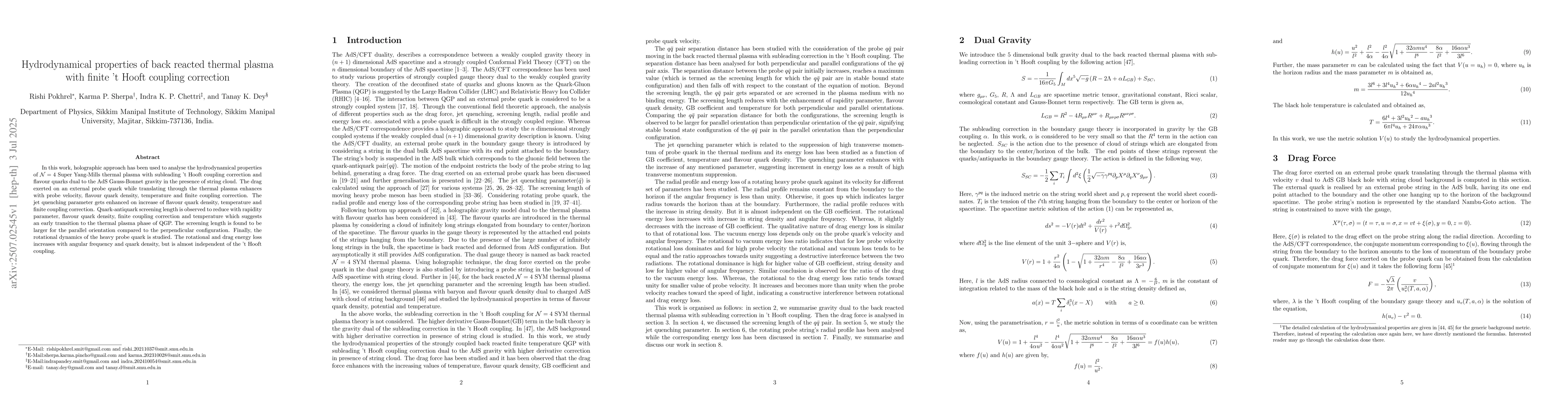 In this work, holographic approach has been used to analyse the hydrodynamical properties of $\mathcal{N}=4$ Super Yang-Mills thermal plasma with subleading 't Hooft coupling correction and flavour quarks dual to the AdS Gauss-Bonnet gravity in the presence of string cloud. The drag exerted on an external probe quark while translating through the thermal plasma enhances with probe velocity, flavour quark density, temperature and finite coupling correction. The jet quenching parameter gets enhanced on increase of flavour quark density, temperature and finite coupling correction. Quark-antiquark screening length is observed to reduce with rapidity parameter, flavour quark density, finite coupling correction and temperature which suggests an early transition to the thermal plasma phase of QGP. The screening length is found to be larger for the parallel orientation compared to the perpendicular configuration. Finally, the rotational dynamics of the heavy probe quark is studied. The rotational and drag energy loss increases with angular frequency and quark density, but is almost independent of the 't Hooft coupling.