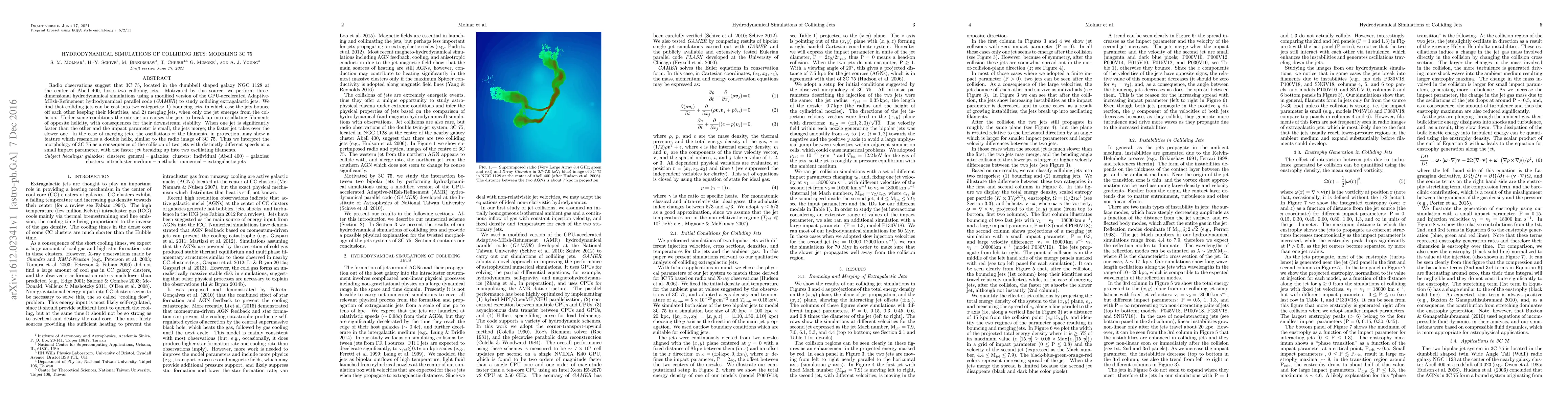 Radio observations suggest that 3C 75, located in the dumbbell shaped galaxy NGC 1128 at the center of Abell 400, hosts two colliding jets. Motivated by this source, we perform three-dimensional hydrodynamical simulations using a modified version of the GPU-accelerated Adaptive-MEsh-Refinement hydrodynamical parallel code ($\mathit{GAMER}$) to study colliding extragalactic jets. We find that colliding jets can be cast into two categories: 1) bouncing jets, in which case the jets bounce off each other keeping their identities, and 2) merging jets, when only one jet emerges from the collision. Under some conditions the interaction causes the jets to break up into oscillating filaments of opposite helicity, with consequences for their downstream stability. When one jet is significantly faster than the other and the impact parameter is small, the jets merge; the faster jet takes over the slower one. In the case of merging jets, the oscillations of the filaments, in projection, may show a feature which resembles a double helix, similar to the radio image of 3C 75. Thus we interpret the morphology of 3C 75 as a consequence of the collision of two jets with distinctly different speeds at a small impact parameter, with the faster jet breaking up into two oscillating filaments.