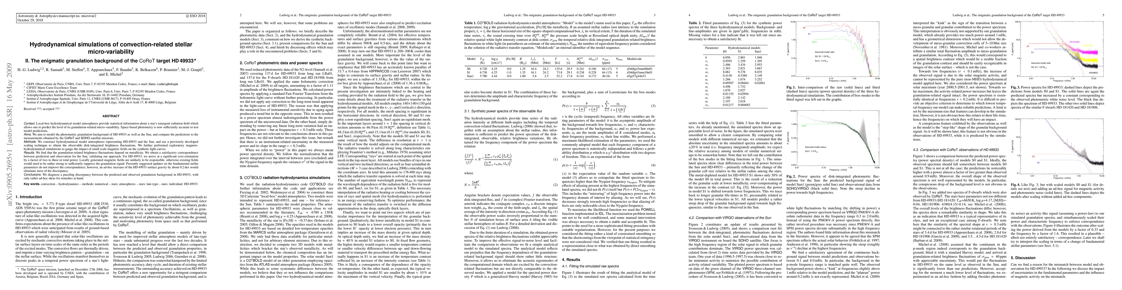 This paper uses hydrodynamical simulations to model the granulation-related micro-variability of HD49933 and the Sun, comparing predictions to observations from COROT and SOHO. While the model matches the Sun's variability well, it significantly over-estimates HD49933's granulation background, suggesting a need for adjustments in its surface gravity.