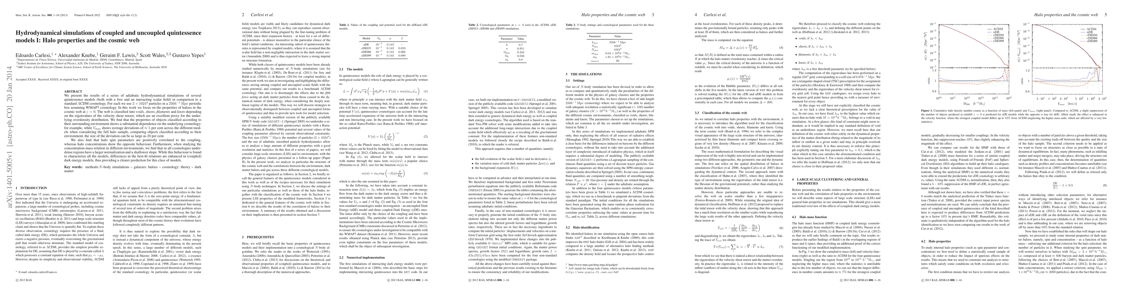 This paper investigates hydrodynamical simulations of quintessence models, comparing their halo properties and cosmic web structure to standard ΛCDM cosmology. It finds significant deviations in halo properties, such as $V_{\rm max}$, and concentration-mass relations, especially in coupled dark energy models, indicating a strong dependence on the underlying cosmology.