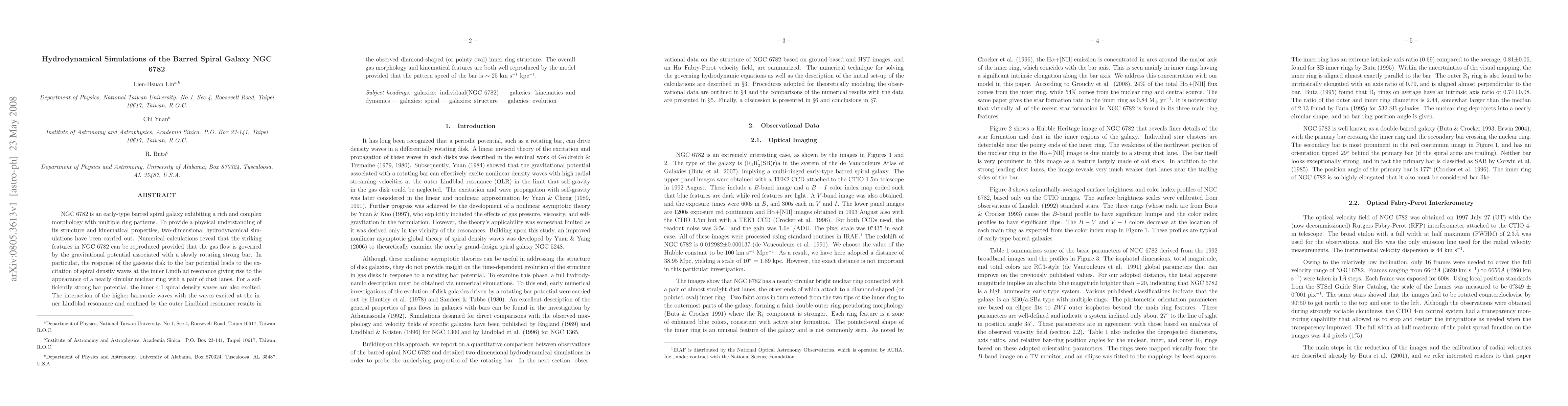 Researchers used hydrodynamical simulations to study the barred spiral galaxy NGC 6782, reproducing its complex ring patterns with a slowly rotating strong bar, and found that a bar potential of around 25 km s$^{-1}$ kpc$^{-1}$ was necessary for accurate modeling.