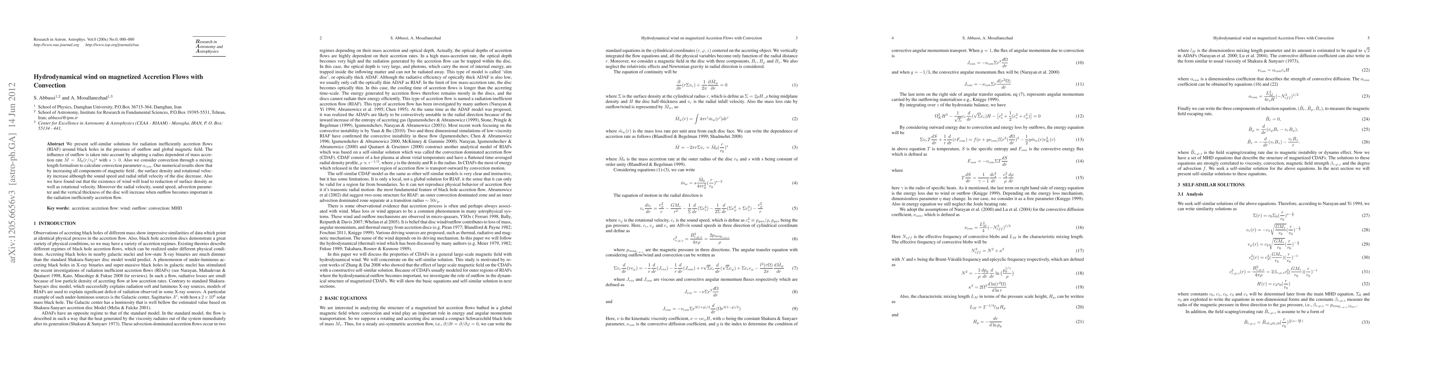 This paper presents self-similar solutions for radiation inefficient accretion flows around black holes, considering the effects of outflow and global magnetic fields. It finds that increasing magnetic field components boosts surface density and rotational velocity while reducing sound speed and radial inflow, and that wind presence decreases surface density and rotational velocity but increases radial velocity and disc thickness.