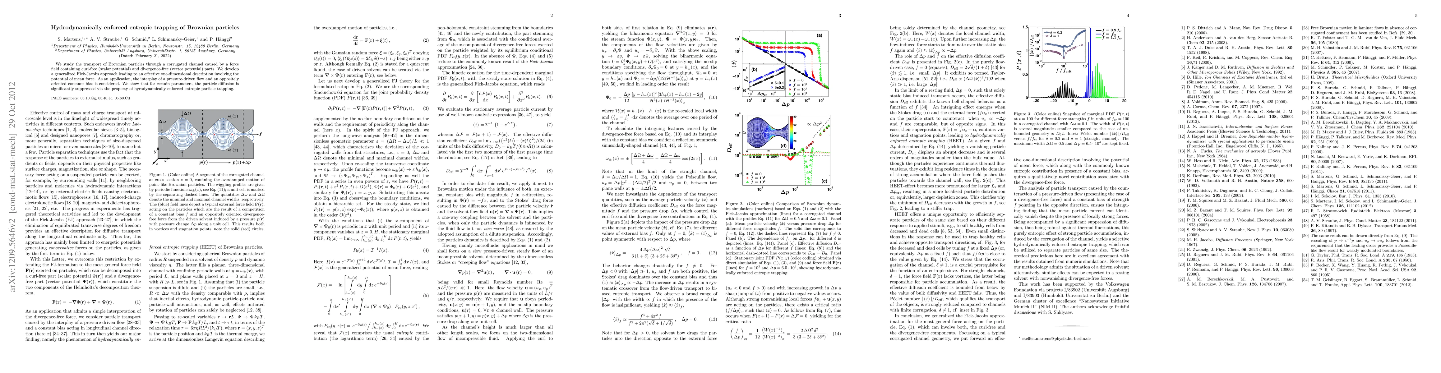 We study the transport of Brownian particles through a corrugated channel caused by a force field containing curl-free (scalar potential) and divergence-free (vector potential) parts. We develop a generalized Fick-Jacobs approach leading to an effective one-dimensional description involving the potential of mean force. As an application, the interplay of a pressure-driven flow and an oppositely oriented constant bias is considered. We show that for certain parameters, the particle diffusion is significantly suppressed via the property of hyrodynamically enforced entropic particle trapping.