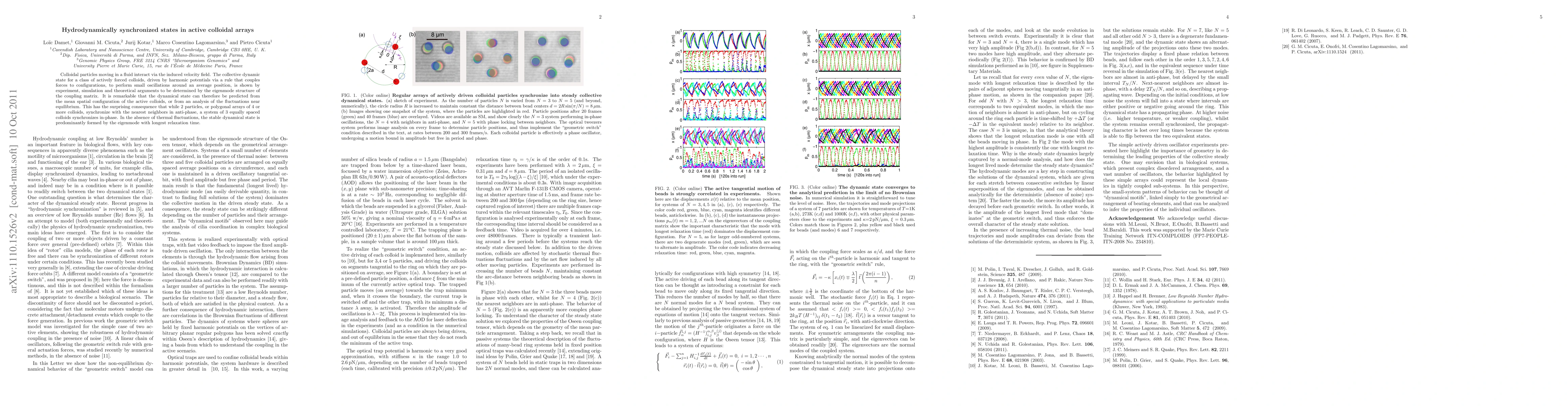 Colloidal particles moving in a fluid interact via the induced velocity field. The collective dynamic state for a class of actively forced colloids, driven by harmonic potentials via a rule that couples forces to configurations, to perform small oscillations around an average position, is shown by experiment, simulation and theoretical arguments to be determined by the eigenmode structure of the coupling matrix. It is remarkable that the dynamical state can therefore be predicted from the mean spatial configuration of the active colloids, or from an analysis of the fluctuations near equilibrium. This has the surprising consequence that while 2 particles, or polygonal arrays of 4 or more colloids, synchronize with the nearest neighbors in anti-phase, a system of 3 equally spaced colloids synchronizes in-phase. In the absence of thermal fluctuations, the stable dynamical state is predominantly formed by the eigenmode with longest relaxation time.