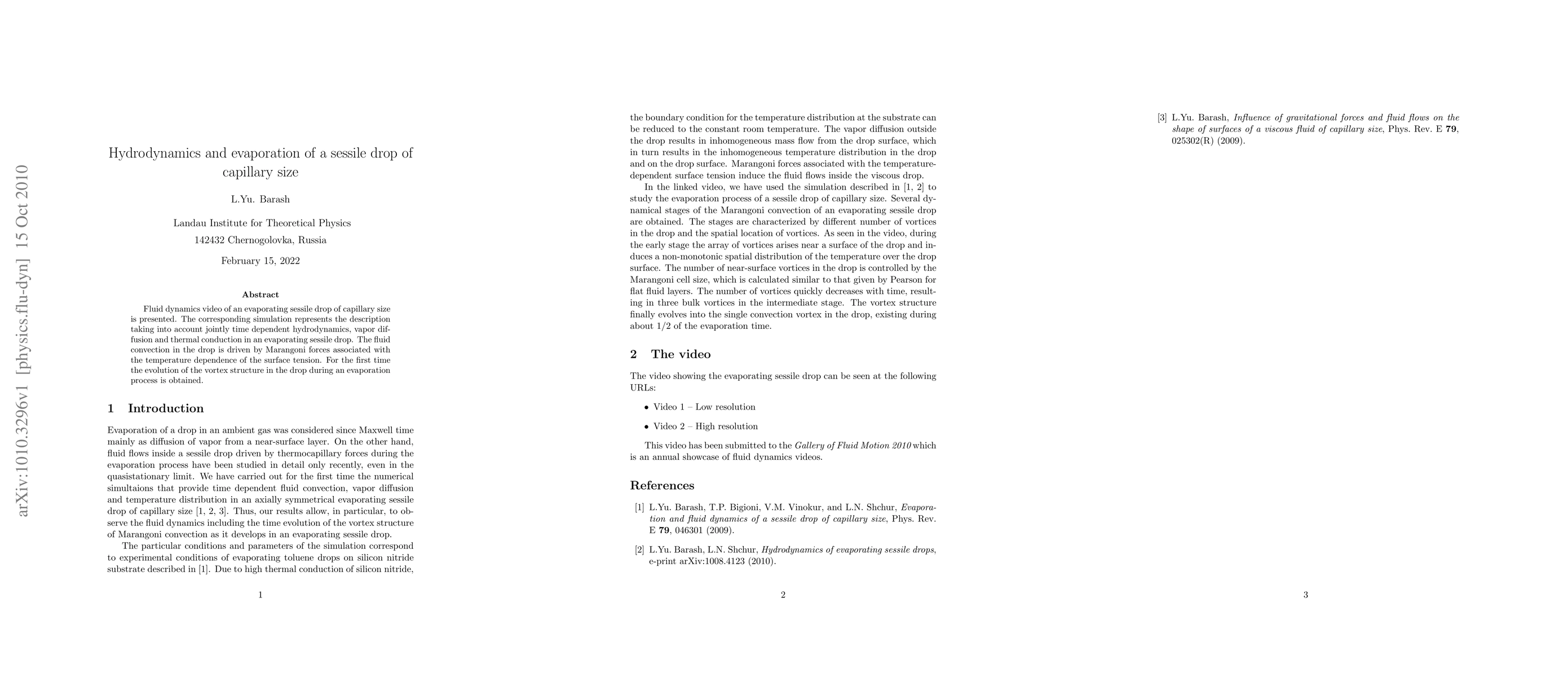 The numerical simulations provide time-dependent fluid convection, vapor diffusion, and temperature distribution in an axially symmetric evaporating sessile drop of capillary size.