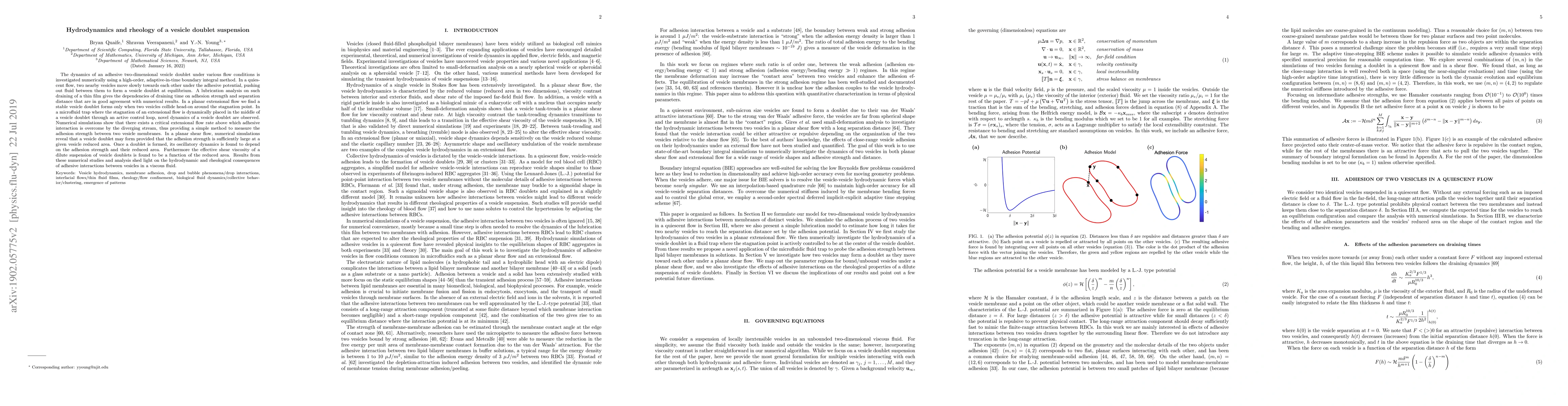 The dynamics of an adhesive two-dimensional vesicle doublet under various flow conditions is investigated numerically using a high-order, adaptive-in-time boundary integral method. In a quiescent flow, two nearby vesicles move slowly towards each other under the adhesive potential, pushing out fluid between them to form a vesicle doublet at equilibrium. A lubrication analysis on such draining of a thin film gives the dependencies of draining time on adhesion strength and separation distance that are in good agreement with numerical results. In a planar extensional flow we find a stable vesicle doublet forms only when two vesicles collide head-on around the stagnation point. In a microfluid trap where the stagnation of an extensional flow is dynamically placed in the middle of a vesicle doublet through an active control loop, novel dynamics of a vesicle doublet are observed. Numerical simulations show that there exists a critical extensional flow rate above which adhesive interaction is overcome by the diverging stream, thus providing a simple method to measure the adhesion strength between two vesicle membranes. In a planar shear flow, numerical simulations reveal that a vesicle doublet may form provided that the adhesion strength is sufficiently large at a given vesicle reduced area. Once a doublet is formed, its oscillatory dynamics is found to depend on the adhesion strength and their reduced area. Furthermore the effective shear viscosity of a dilute suspension of vesicle doublets is found to be a function of the reduced area. Results from these numerical studies and analysis shed light on the hydrodynamic and rheological consequences of adhesive interactions between vesicles in a viscous fluid.