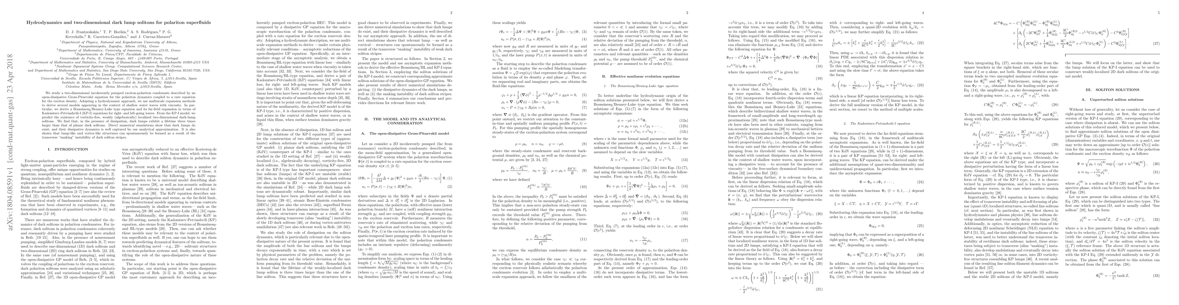 We study a two-dimensional incoherently pumped exciton-polariton condensate described by an open-dissipative Gross-Pitaevskii equation for the polariton dynamics coupled to a rate equation for the exciton density. Adopting a hydrodynamic approach, we use multiscale expansion methods to derive several models appearing in the context of shallow water waves with viscosity. In particular, we derive a Boussinesq/Benney-Luke type equation and its far-field expansion in terms of Kadomtsev-Petviashvili-I (KP-I) equations for right- and left-going waves. From the KP-I model, we predict the existence of vorticity-free, weakly (algebraically) localized two-dimensional dark-lump solitons. We find that, in the presence of dissipation, dark lumps exhibit a lifetime three times larger than that of planar dark solitons. Direct numerical simulations show that dark lumps do exist, and their dissipative dynamics is well captured by our analytical approximation. It is also shown that lump-like and vortex-like structures can spontaneously be formed as a result of the transverse "snaking" instability of dark soliton stripes.