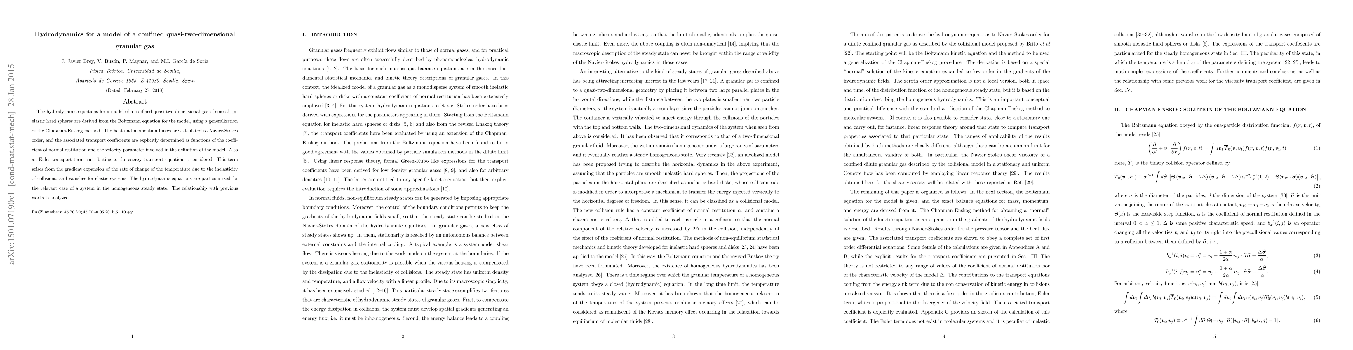 The hydrodynamic equations for a model of a confined quasi-two-dimensional gas of smooth inelastic hard spheres are derived from the Boltzmann equation for the model, using a generalization of the Chapman-Enskog method. The heat and momentum fluxes are calculated to Navier-Stokes order, and the associated transport coefficients are explicitly determined as functions of the coefficient of normal restitution and the velocity parameter involved in the definition of the model. Also an Euler transport term contributing to the energy transport equation is considered. This term arises from the gradient expansion of the rate of change of the temperature due to the inelasticity of collisions, and vanishes for elastic systems. The hydrodynamic equations are particularized for the relevant case of a system in the homogeneous steady state. The relationship with previous works is analyzed.