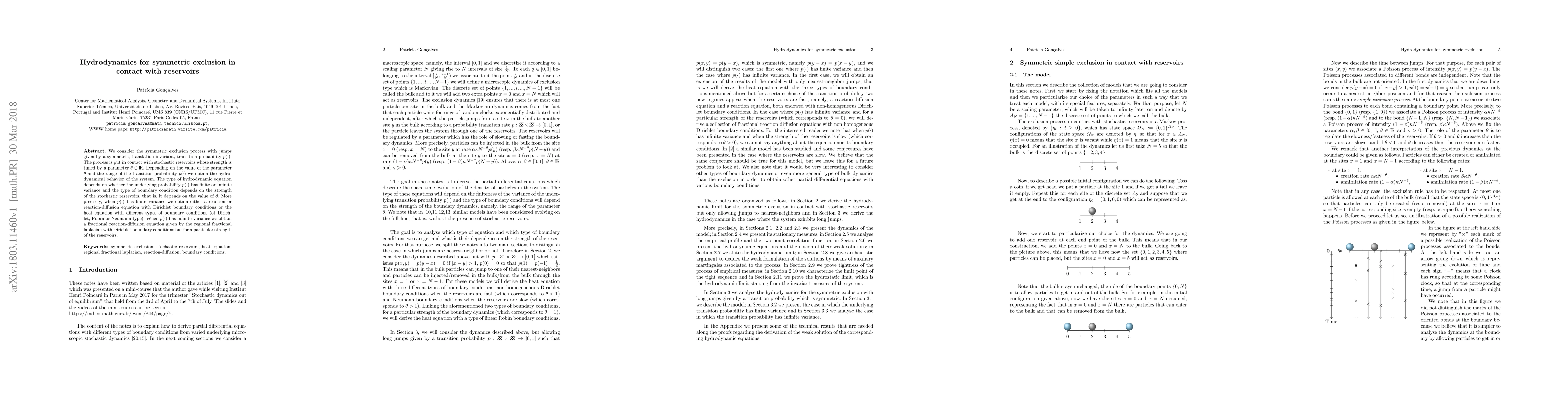 The paper investigates how a symmetric exclusion process interacts with reservoirs of varying strength, leading to different hydrodynamic equations depending on the variance of the underlying probability distribution and boundary conditions.