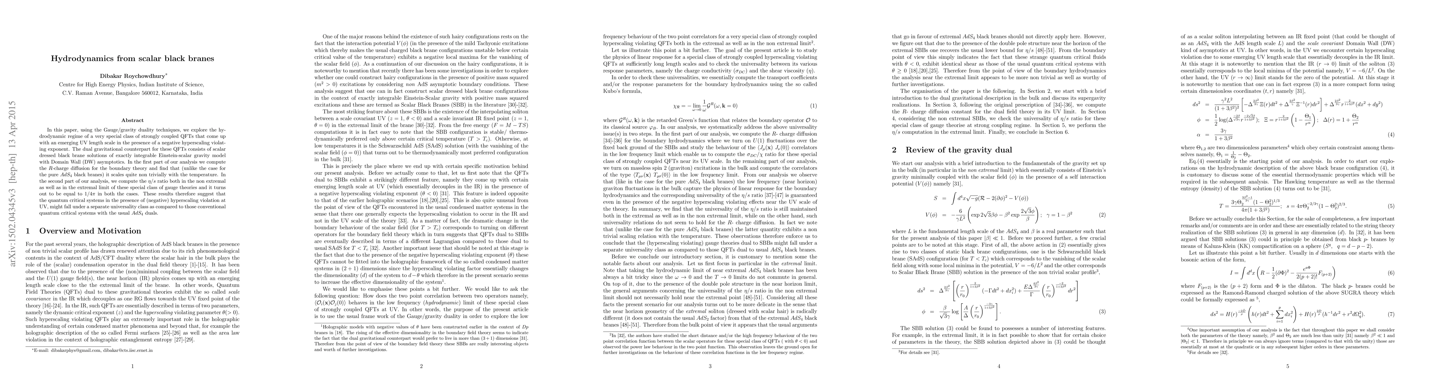 In this paper, using the Gauge/gravity duality techniques, we explore the hydrodynamic regime of a very special class of strongly coupled QFTs that come up with an emerging UV length scale in the presence of a negative hyperscaling violating exponent. The dual gravitational counterpart for these QFTs consists of scalar dressed black brane solutions of exactly integrable Einstein-scalar gravity model with Domain Wall (DW) asymptotics. In the first part of our analysis we compute the $ R $-charge diffusion for the boundary theory and find that (unlike the case for the pure $ AdS_{4} $ black branes) it scales quite non trivially with the temperature. In the second part of our analysis, we compute the $ \eta/s $ ratio both in the non extremal as well as in the extremal limit of these special class of gauge theories and it turns out to be eqaul to $ 1/4\pi $ in both the cases. These results therefore suggest that the quantum critical systems in the presence of (negative) hyperscaling violation at UV, might fall under a separate universality class as compared to those conventional quantum critical systems with the usual $ AdS_4 $ duals.