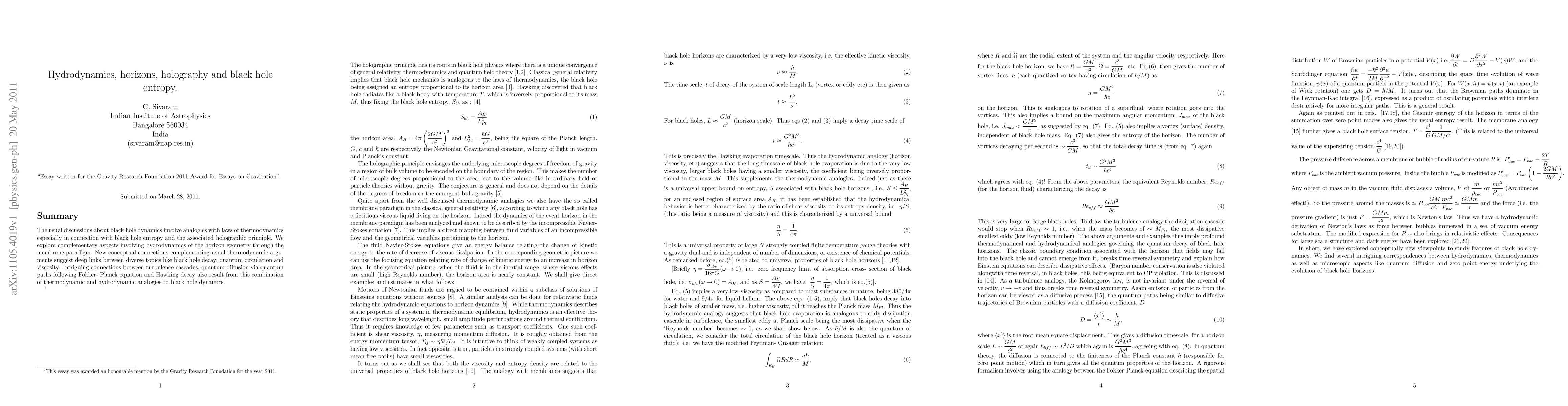 This paper explores the hydrodynamics of black hole horizons through the membrane paradigm, revealing deep connections between black hole entropy, the holographic principle, and thermodynamic analogies. It uncovers links between black hole decay, quantum circulation, viscosity, turbulence cascades, and quantum diffusion via the Fokker-Planck equation.