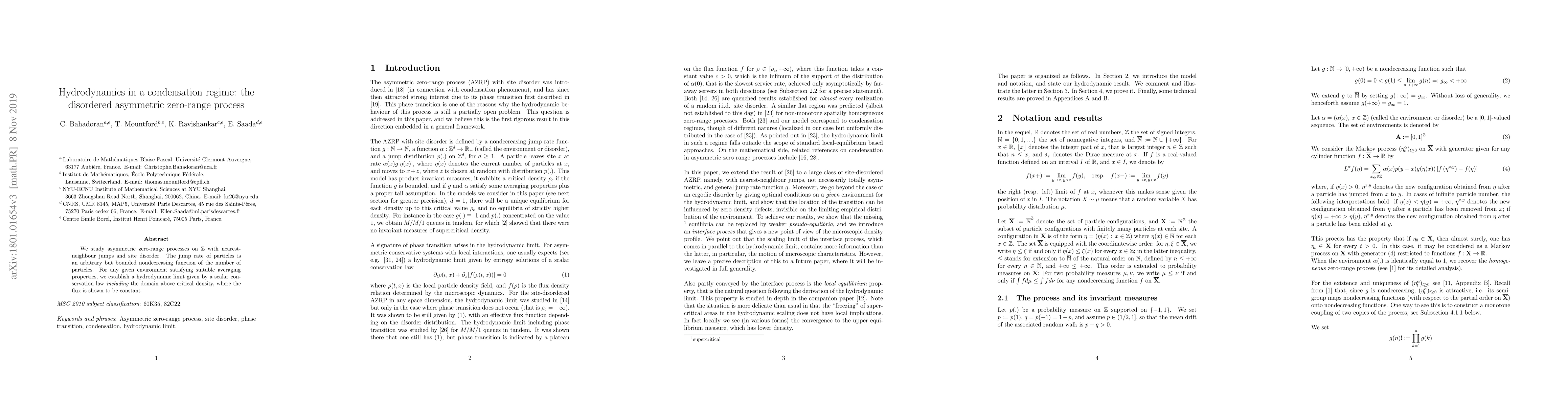 This paper investigates asymmetric zero-range processes on a lattice with site disorder and establishes a hydrodynamic limit described by a scalar conservation law, demonstrating a constant flux above critical density. The study focuses on nearest-neighbour jumps and bounded nondecreasing jump rates.